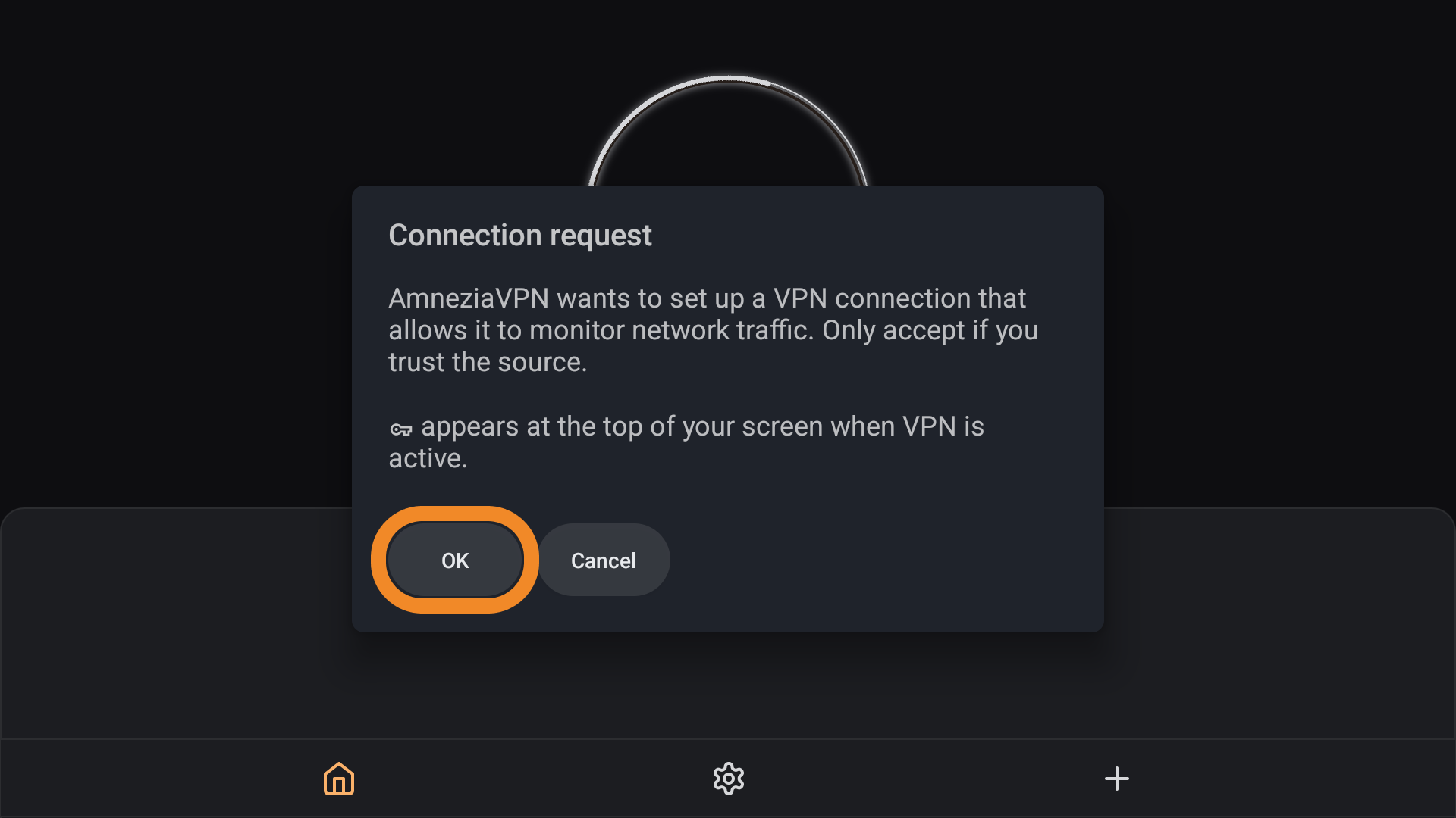 When you first connect, Android TV will request permission for the app to set up VPN connections — tap OK.