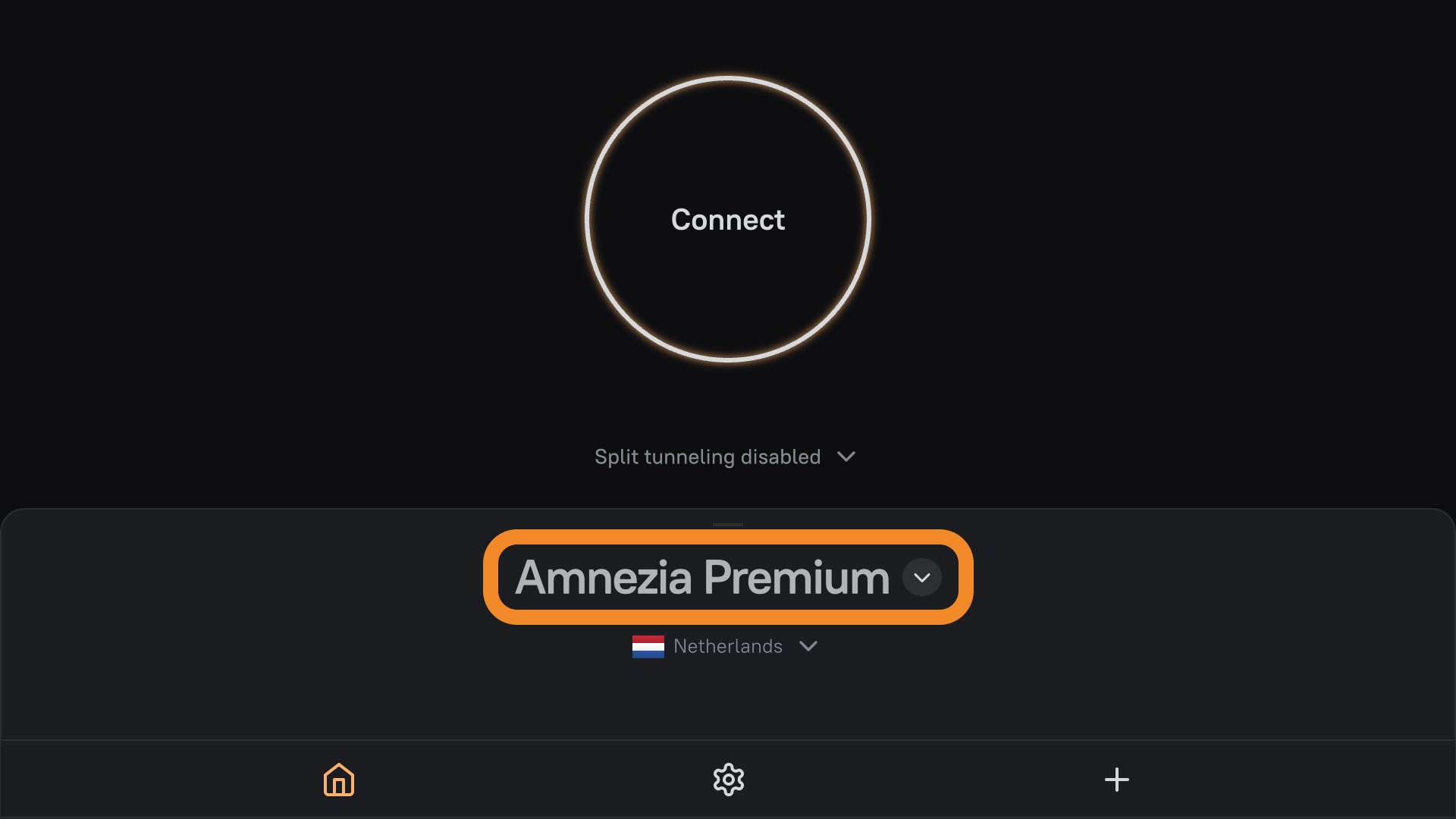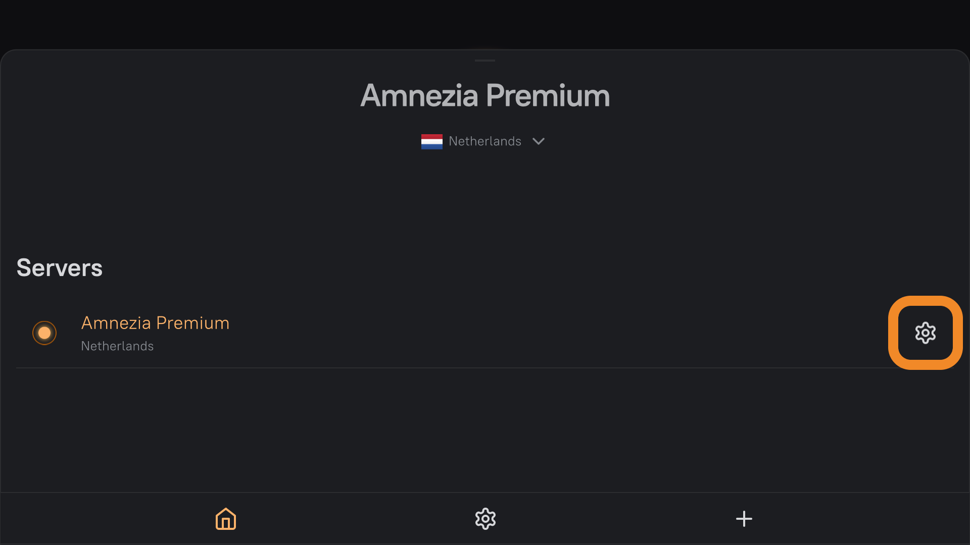 If you can’t open the Locations screen from the app’s Home screen, tap your Amnezia VPN connection, then tap the ⚙️ (gear) icon to the right of the Amnezia VPN — this opens the full list of locations you can connect to.