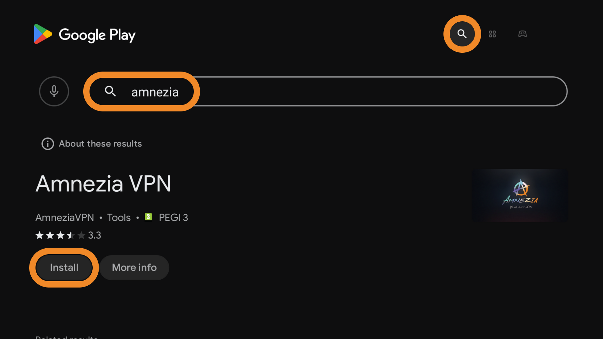 - Type AmneziaVPN in the search bar and install the app.