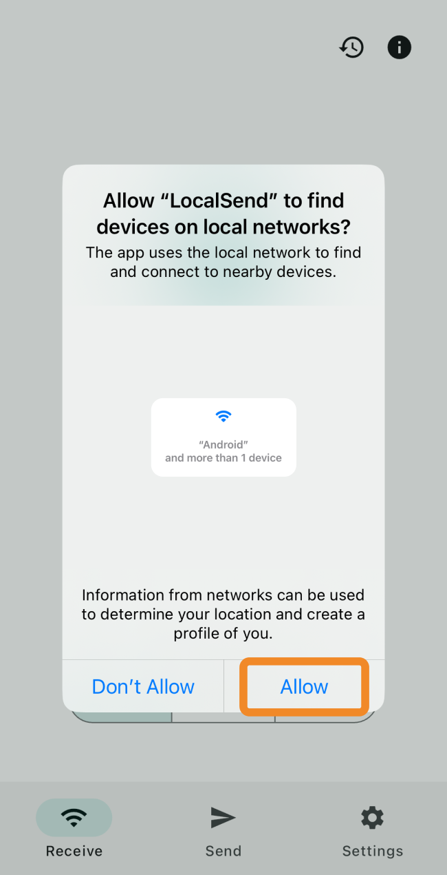 - Open LocalSend. If the system asks for local network access, allow it — otherwise you won’t be able to send data to Android TV.