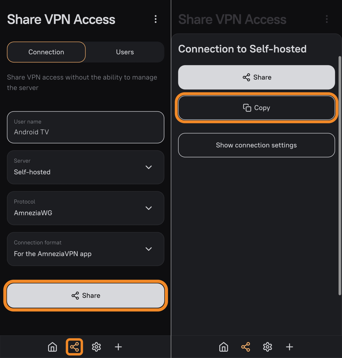 - On the second device, open AmneziaVPN, go to Share VPN Access (the second icon on the app’s bottom bar), and tap Share.