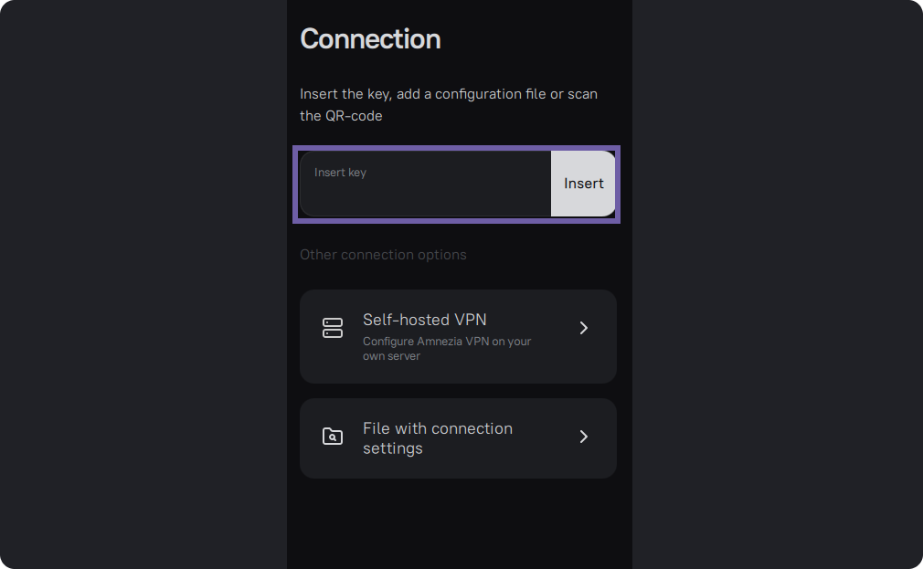 - Paste the key into the first line of the AmneziaVPN app.