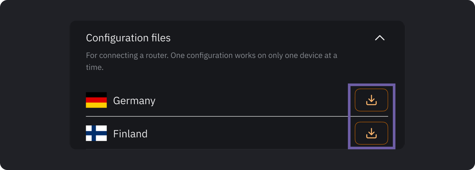 If you choose to use AmneziaWG, instead of a key, you will need to use configuration files from your Subscription Dashboard. One configuration file allows connection to only one location, can be used on only one device, and counts as one active connection.