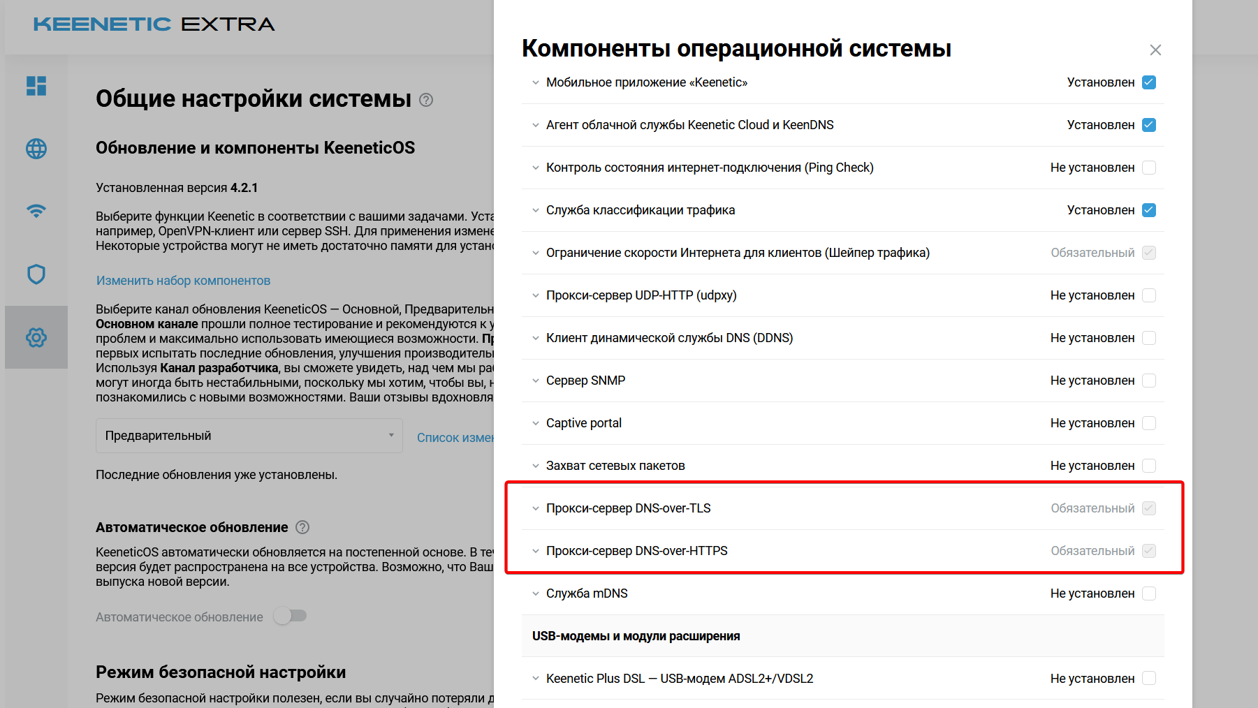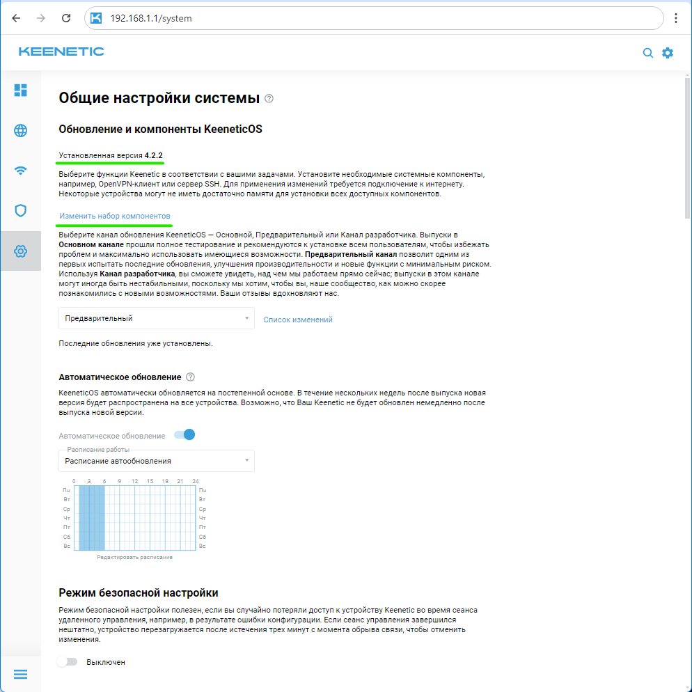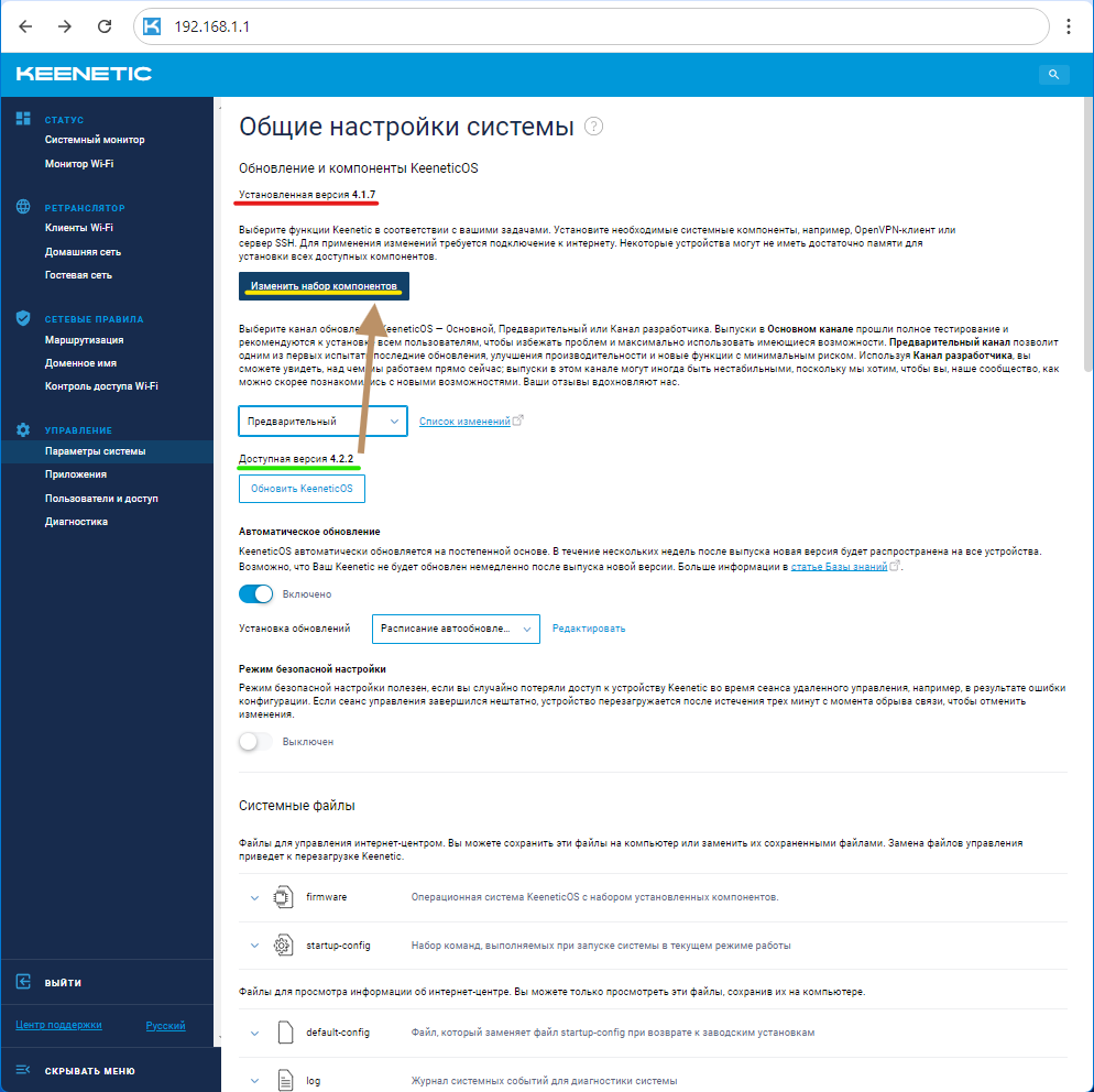 Если уже установлена версия KeeneticOS 4.2 или предлагается обновление до 4.2, проверьте наличие необходимого компонента системы. Нажмите кнопку "Изменить набор компонентов".