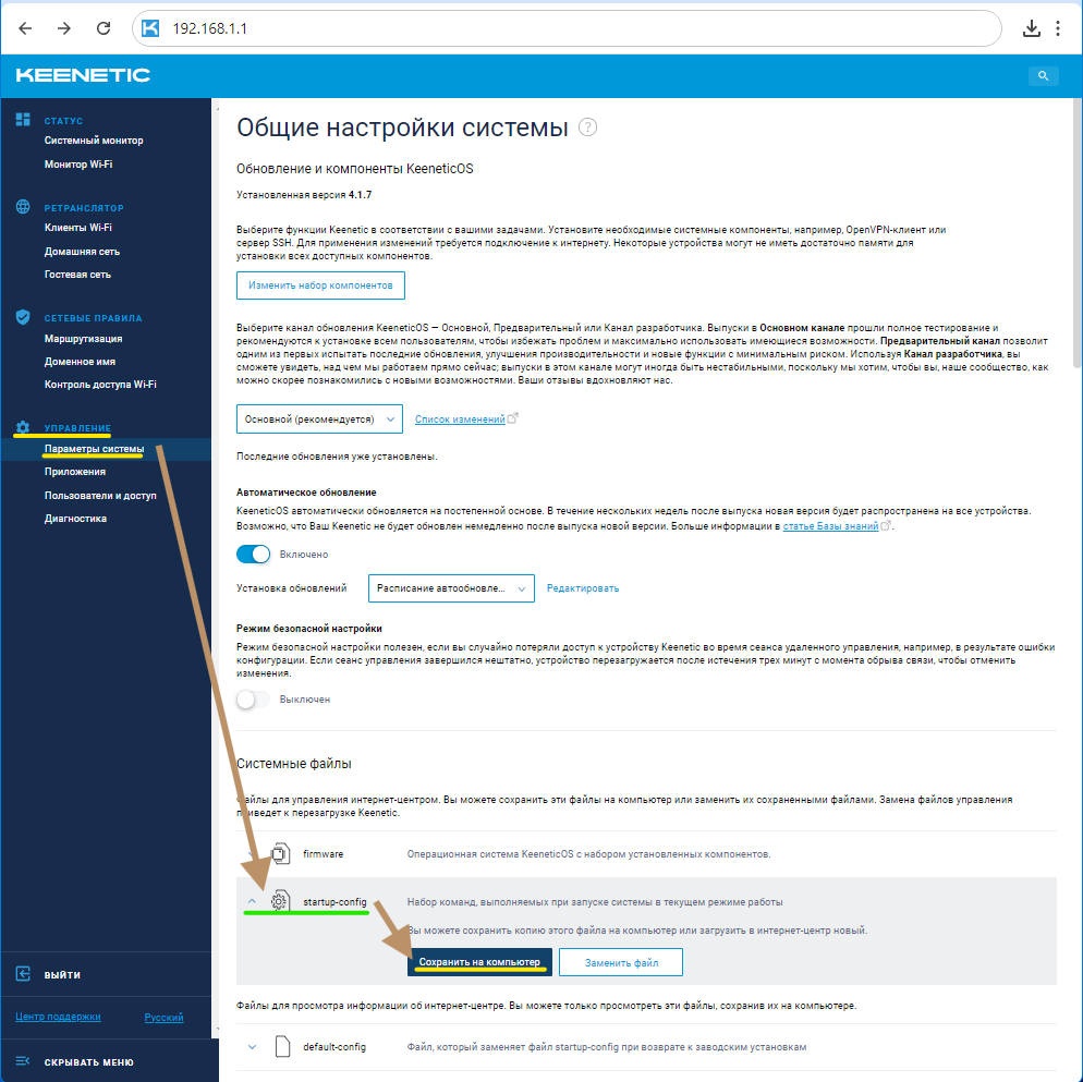 Сразу после авторизации перейдите в раздел "Управление", далее "Параметры системы", разверните пункт "startup-config" и сохраните резервную копию нынешних настроек вашего роутера.