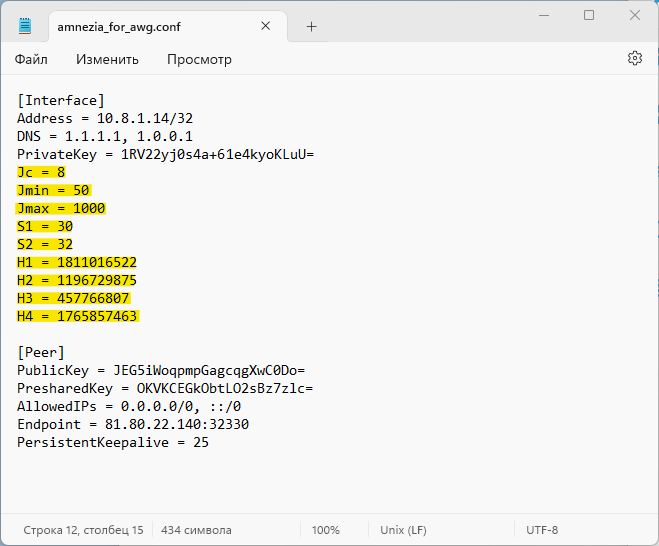Теперь, зная имя интерфейса и значения параметров asc из файла в формате .conf, который мы сохранили ранее, нужно заменить вс е значения шаблона в скобках вашими значениями, а сами скобки удалить.
