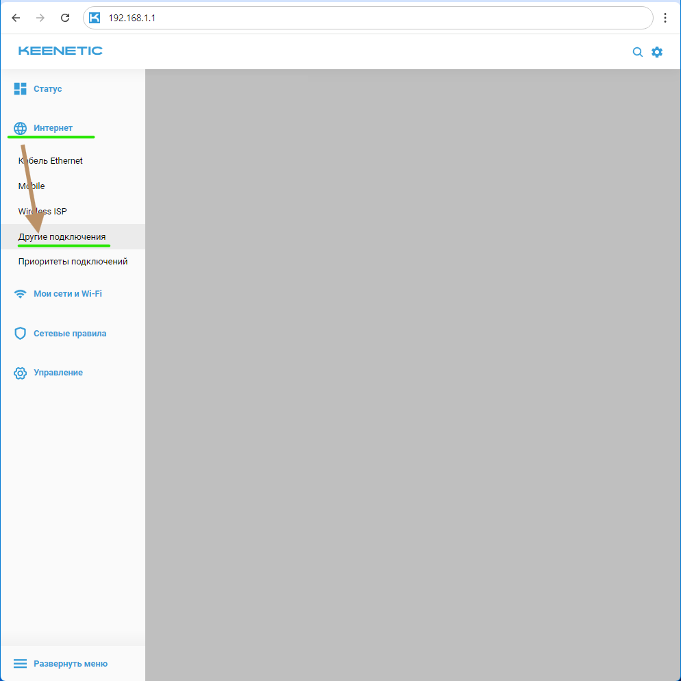 Теперь вам нужно вернуться к настройкам роутера и перейти в раздел "Интернет" и выбрать "Другие подключения".