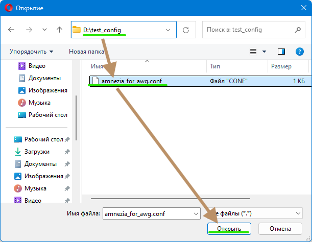 В появившемся окне файлового менеджера перейдите в папку, где вы сохранили файл конфигурации AmneziaWG, выберите его и нажмите кнопку "Открыть".