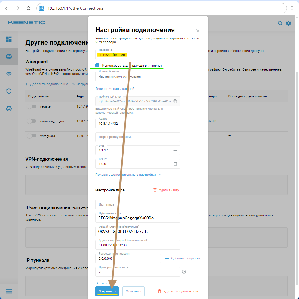 Создание подключения WireGuard с дополнительными параметрами asc в обновлённом интерфейсе роутеров KeeneticOS 4.2.