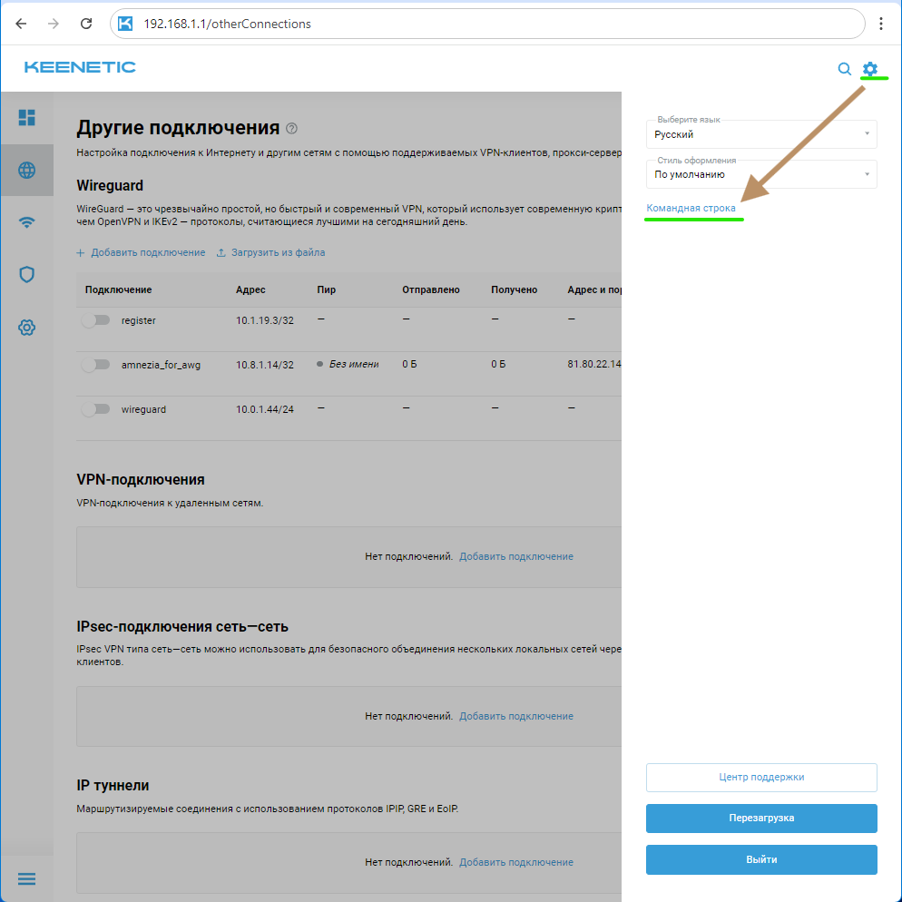 Теперь вам нужно перейти в веб-версию командной строки роутера Keenetic для выполнения ряда команд. Для этого необходимо перейти в настройки, нажать на изображение шестеренки в правом верхнем углу веб-страницы и перейти по ссылке "Командная строка".