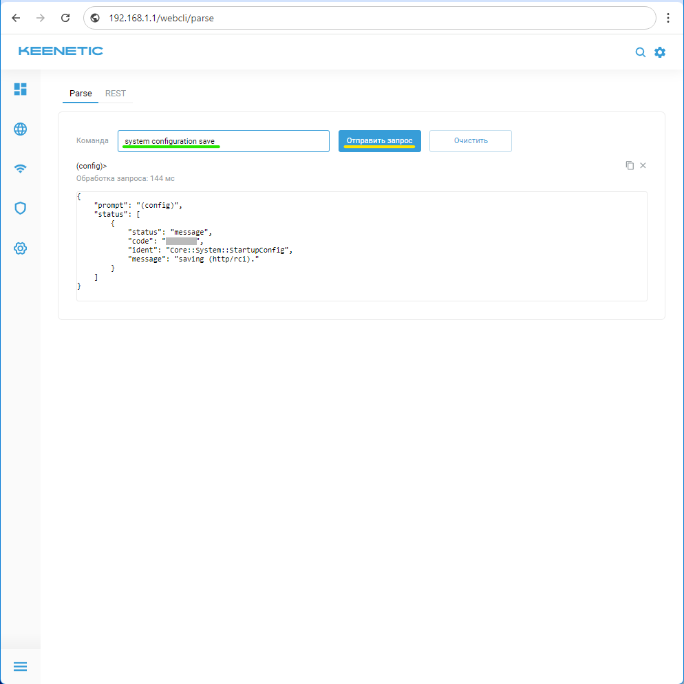 Теперь следует сохранить изменения в конфигурации роутера. Введите команду system configuration save и нажмите "Отправить запрос". Если всё введено верно, ниже будет выведен результат обработки запроса как на приведённом скриншоте.