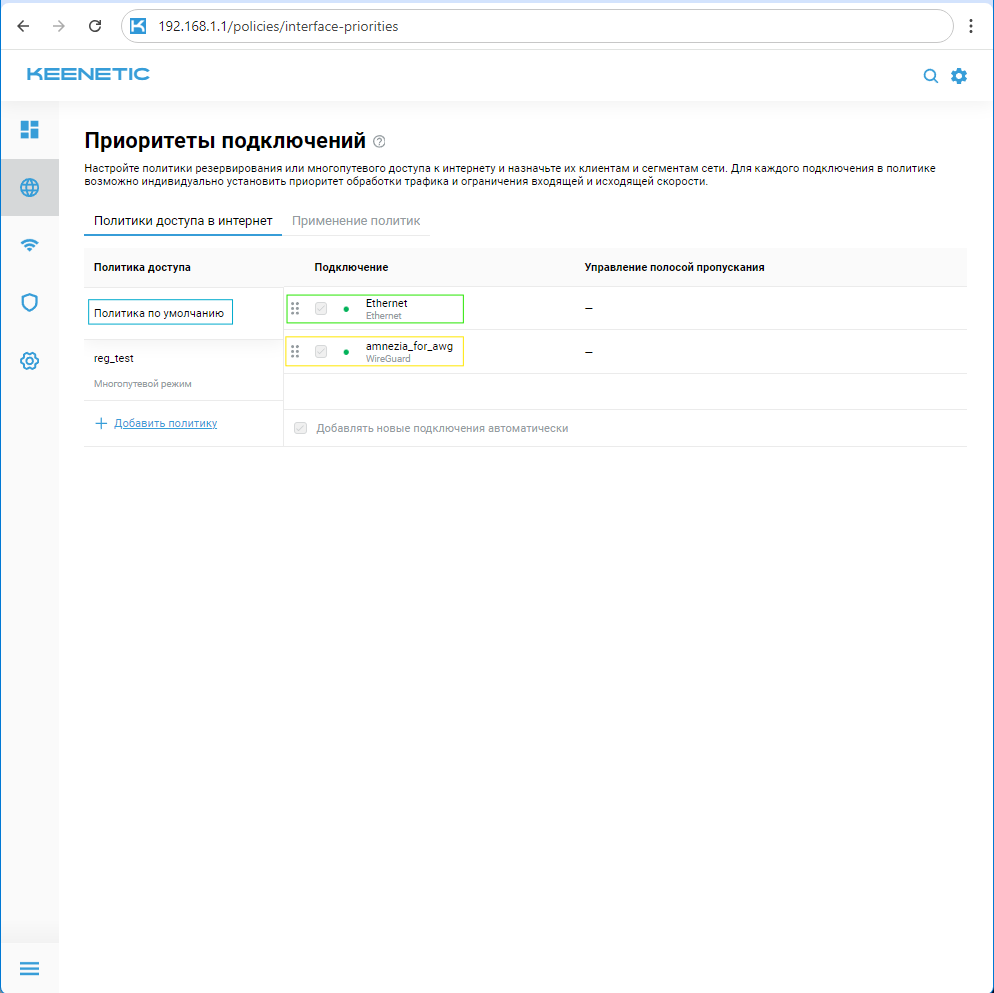 Если в политику VPN включить вторым по порядку подключение Ethernet, то при отключении amnezia_for_awg все устройства политики VPN будут переходить на использование основного интернет-подключения (в данном примере Ethernet). Это может быть удобно для переключения между разными соединениями без постоянного переноса устройств между разными политиками, однако это может вызывать утечки трафика через основное интернет-соединение.