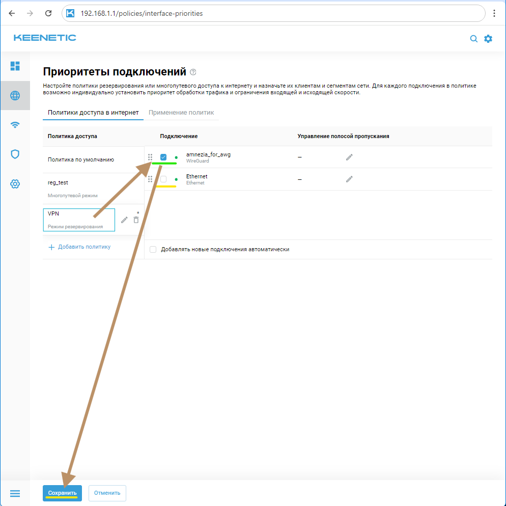 Далее для политики с названием VPN установите чек-бокс активности только на ранее созданном подключении (в данном примере amnezia_for_awg) и нажмите кнопку Сохранить внизу страницы.