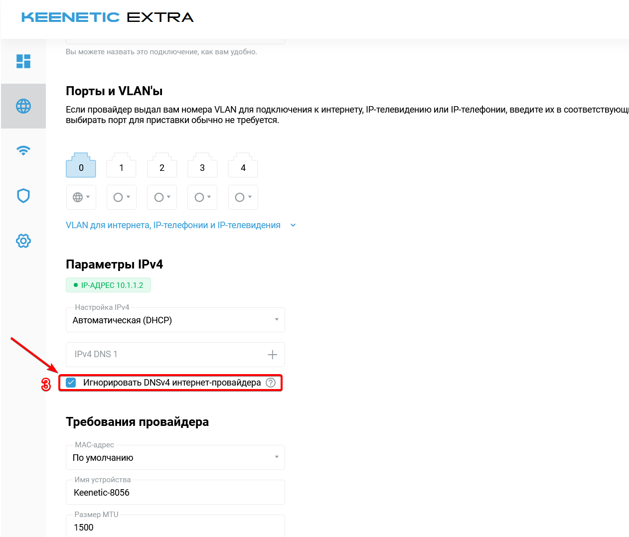 В разделе "Порты и VLANы" поставьте галочку "Игнорировать DNSv4 интернет-провайдера"