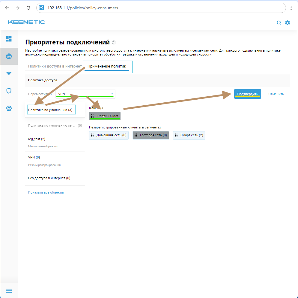Нажмите кнопку "Подтвердить" для перемещения выбранных устройств в политику "VPN".