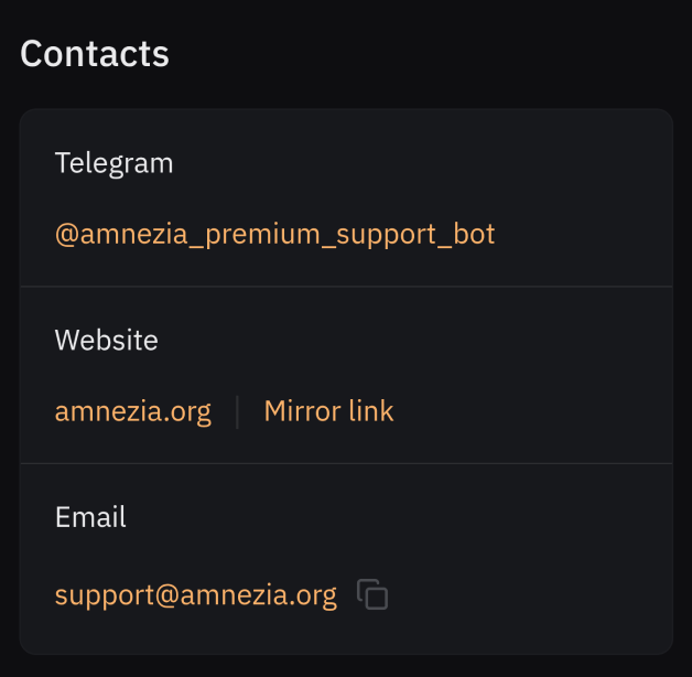 - Telegram chat https://t.me/amnezia_premium_support_bot