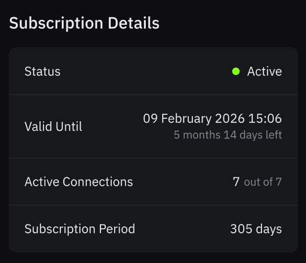 By default, subscriptions coexist separately. If you want to use the new subscription to extend your current one, write to our Telegram chat or email [email protected] — within 1–2 days we’ll merge the subscriptions.