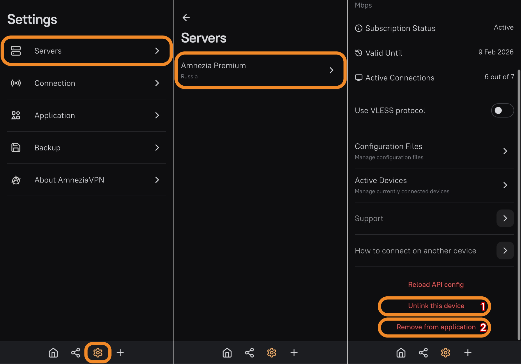 To permanently revoke access on a device, open AmneziaVPN on it → ⚙️ (gear) on the bottom bar → Servers → Amnezia VPN → Unlink this device → Remove from application.