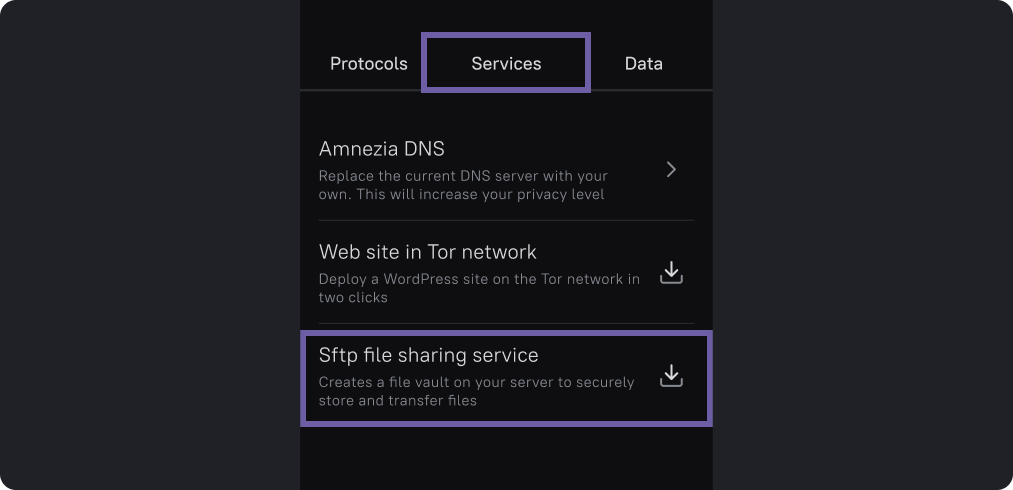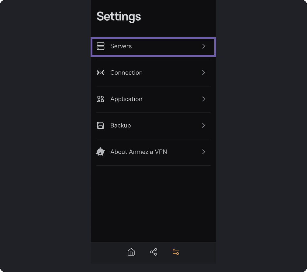 In addition to creating and using VPNs, with Amnezia, you can deploy a file storage system on your virtual server. Open the Amnezia home screen. At the bottom, click on the settings icon.