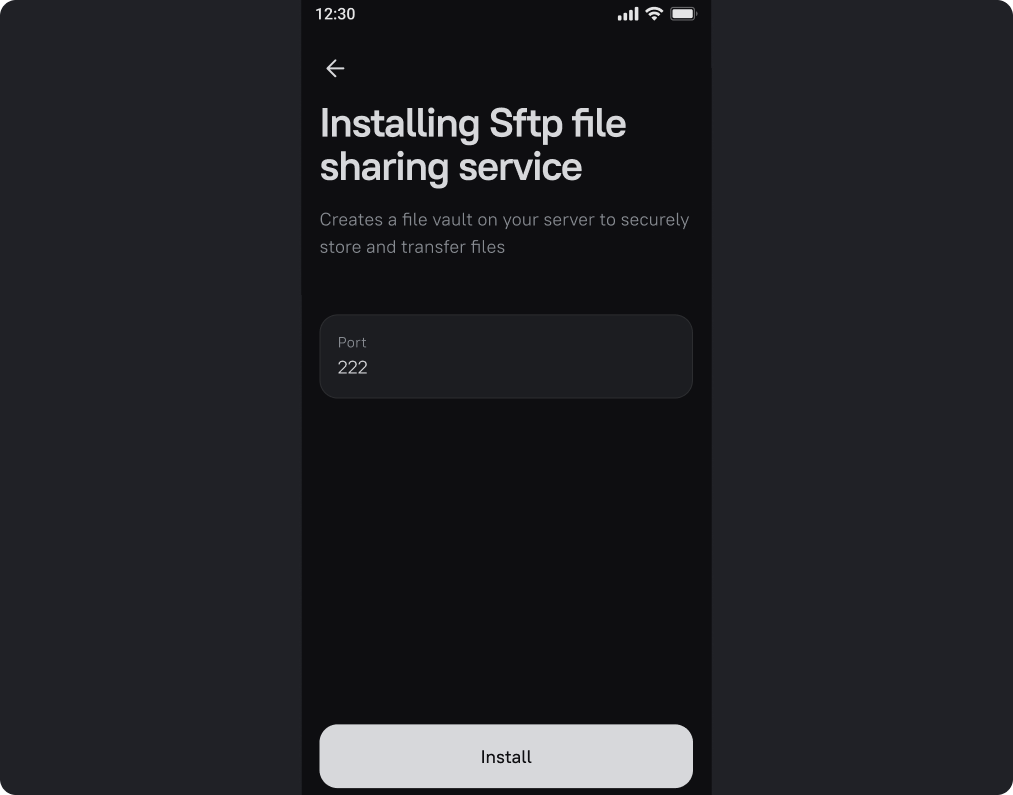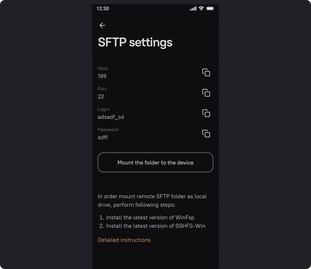 After successful installation, you will see a screen with settings and data for connecting to the file storage.