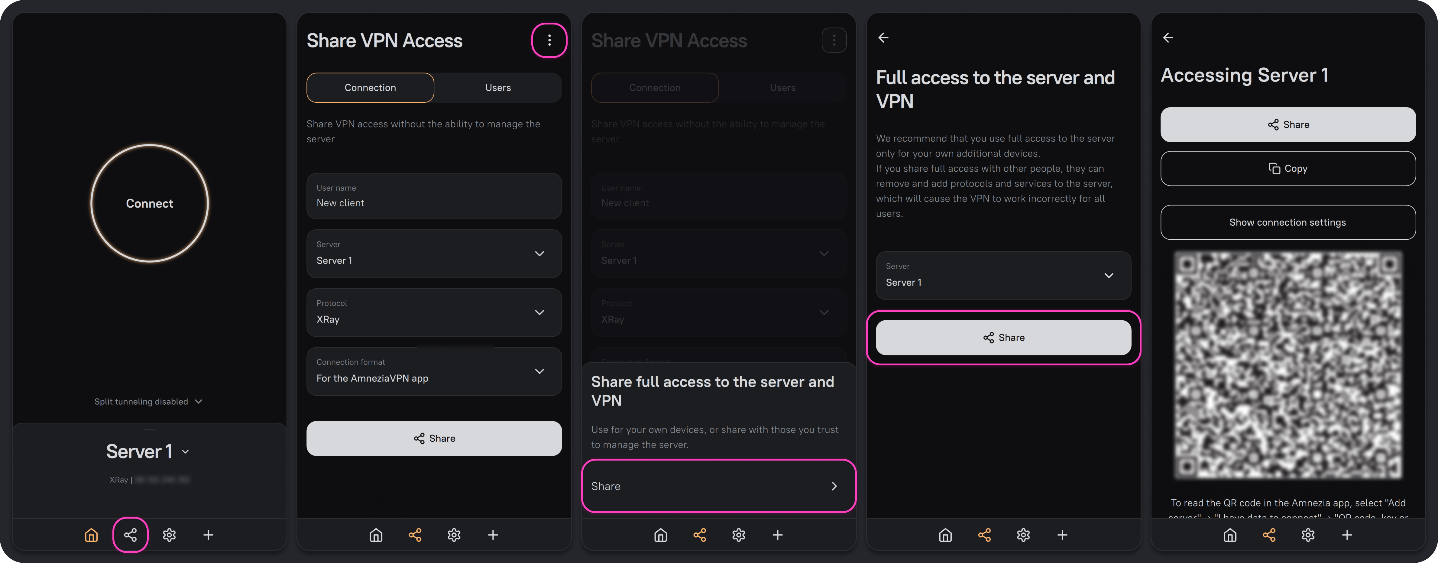 - Open the AmneziaVPN app with an existing full access connection to the server, then click the Share icon on the bottom bar to the left of the gear icon.