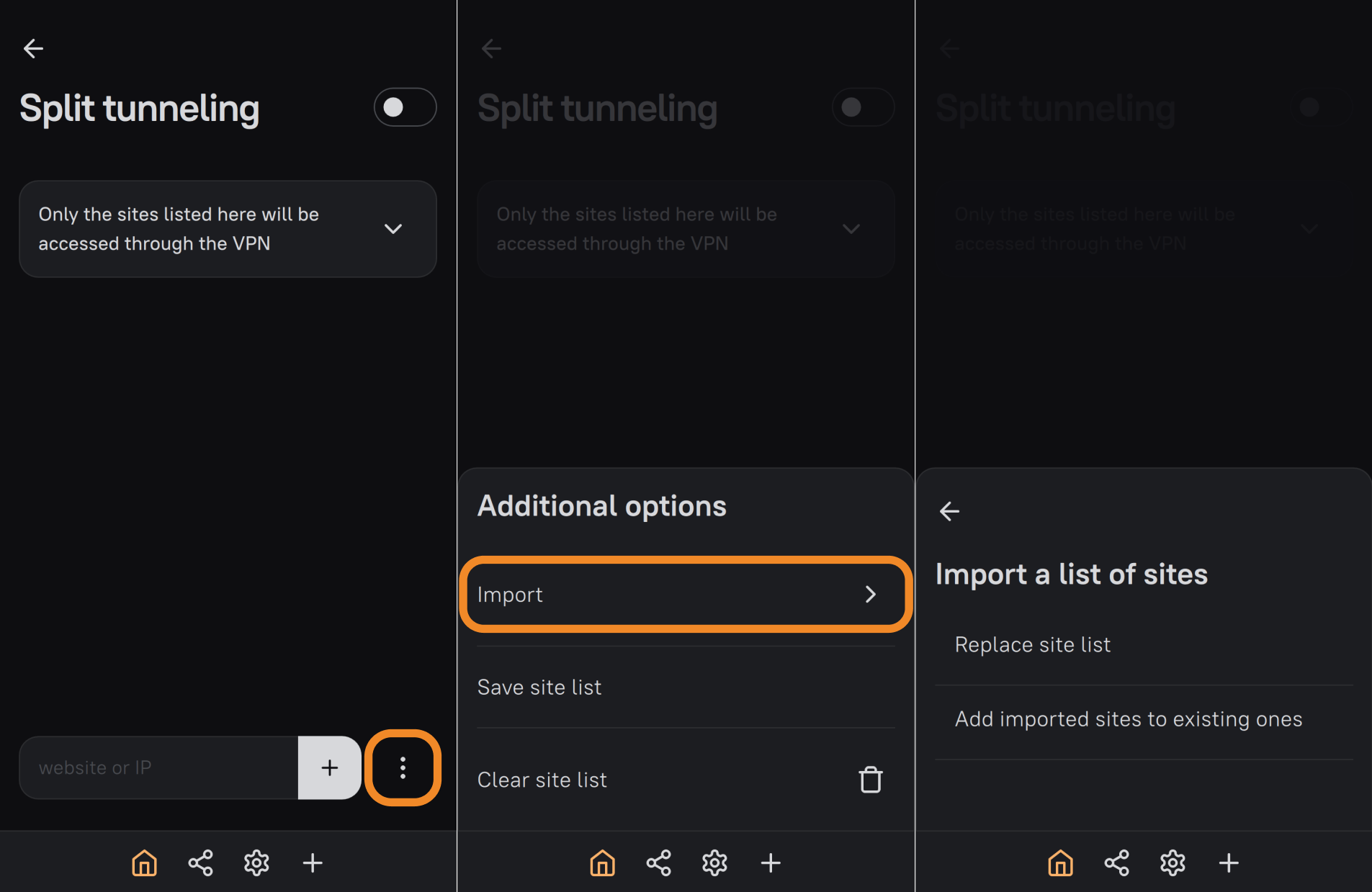 - Click ⋮ (three dots) and choose how to import (Replace site list or Add imported sites to existing ones).