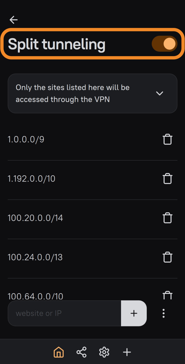 - Open split tunneling settings for sites (IPs) in AmneziaVPN and select Only the sites listed here will be accessed through the VPN.