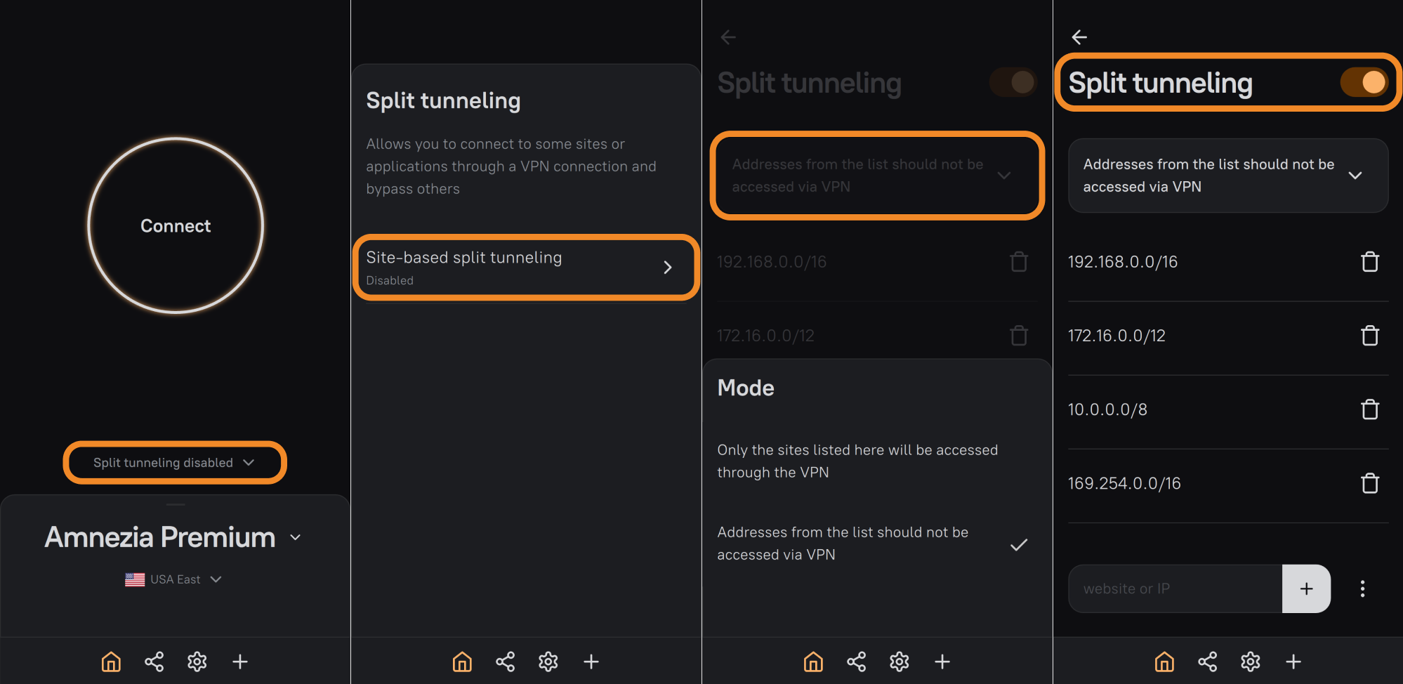 For Amnezia connection, split tunneling by IP addresses is not available.