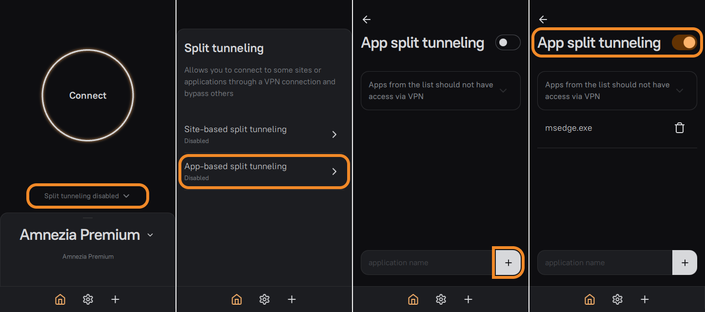 Split tunneling is an AmneziaVPN feature that lets you choose IP addresses/subnets and apps that should either use the VPN tunnel or bypass it.