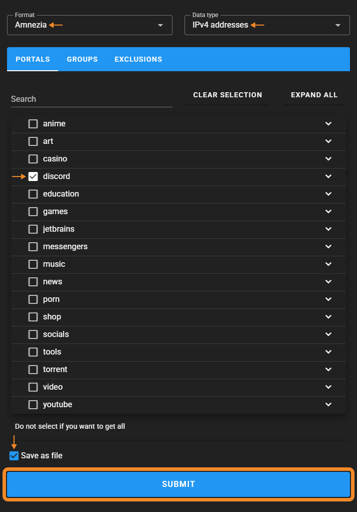 - Go to https://iplist.opencck.org → choose format Amnezia and data type IPv4 addresses.