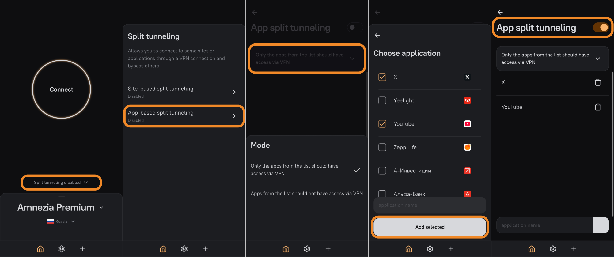 In Windows, AmneziaVPN supports a single app split mode in which only apps from your list work without VPN. The opposite mode — "only apps from the list work through VPN" — is available in AmneziaVPN on Android and is not available on Windows.