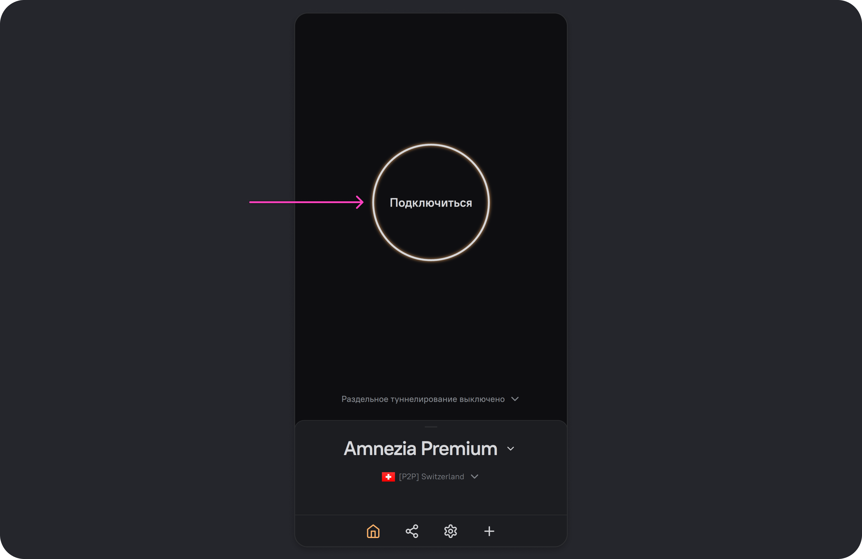 Когда процесс установки завершится, у вас сразу же откроется приложение AmneziaVPN — можно подключаться.