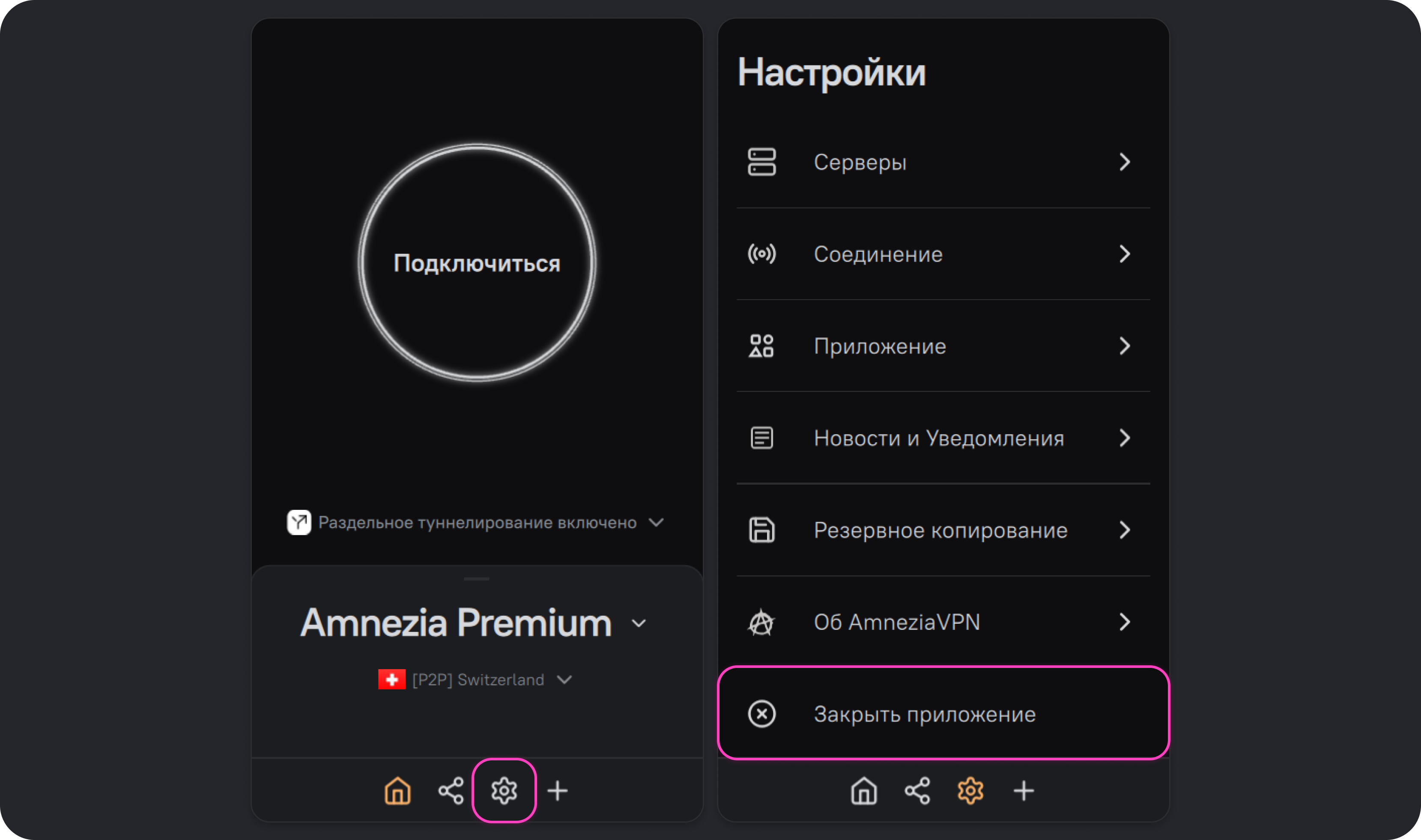 - Вернитесь в приложение AmneziaVPN, зайдите в настройки и нажмите Закрыть приложение.