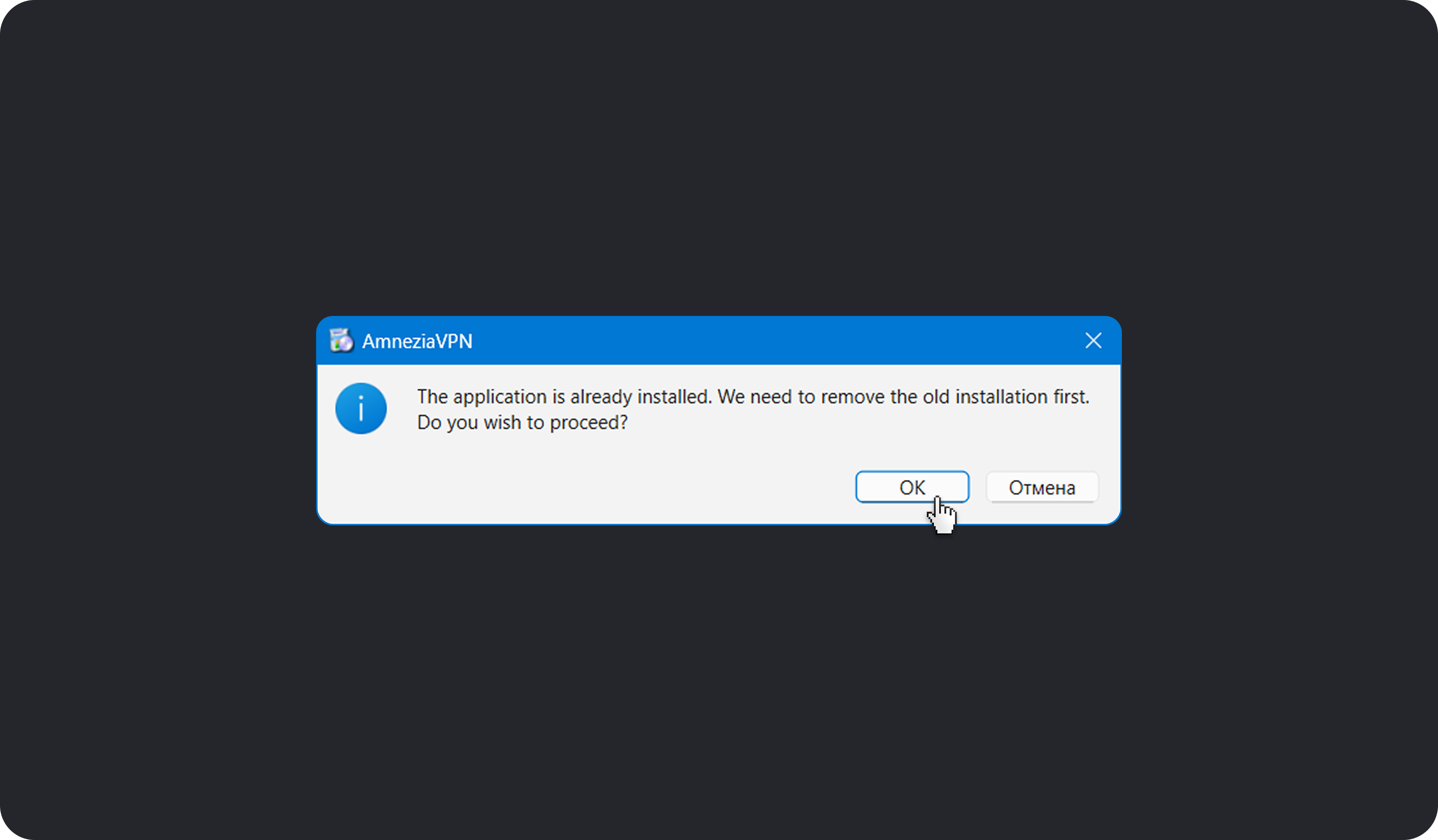 .exe, во всплывающем окне нажмите кнопку OK, чтобы перейти к процессу удаления установленной версии приложения AmneziaVPN.