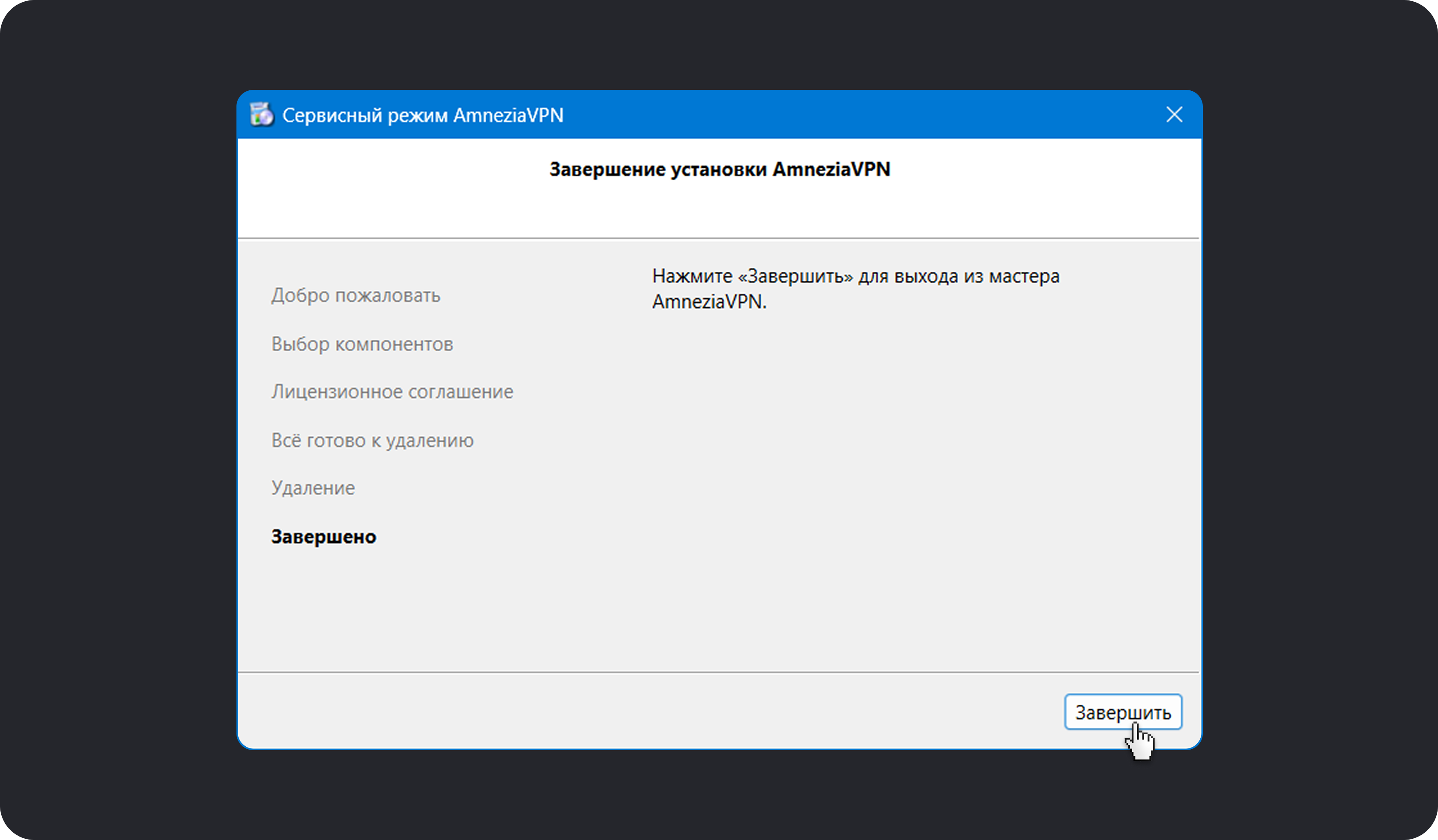 - Если приложение AmneziaVPN успешно закрылось, у вас появится окно с таким сообщением: