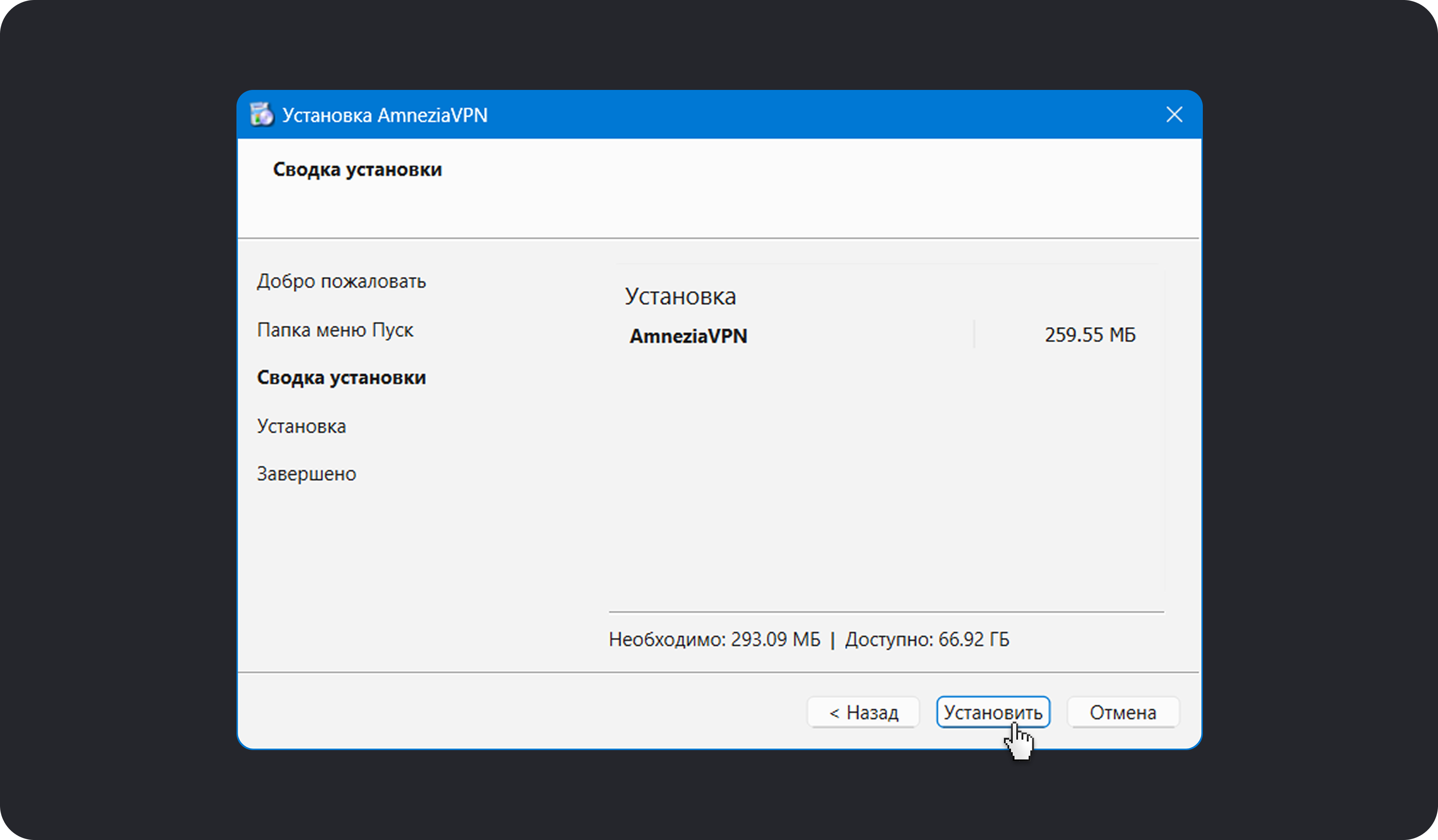 - После удаления AmneziaVPN откроется окно установки новой версии приложения. Нажмите Далее → Установить.