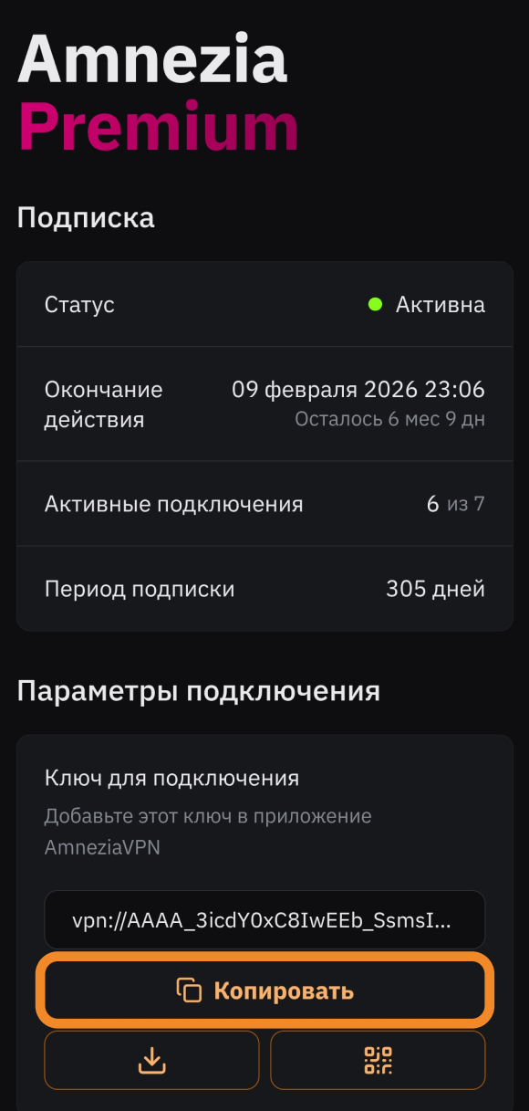 - Скопируйте ключ vpn:// из веб-версии личного кабинета или из письма с деталями заказа, которое вы получили после оплаты Premium-подписки.