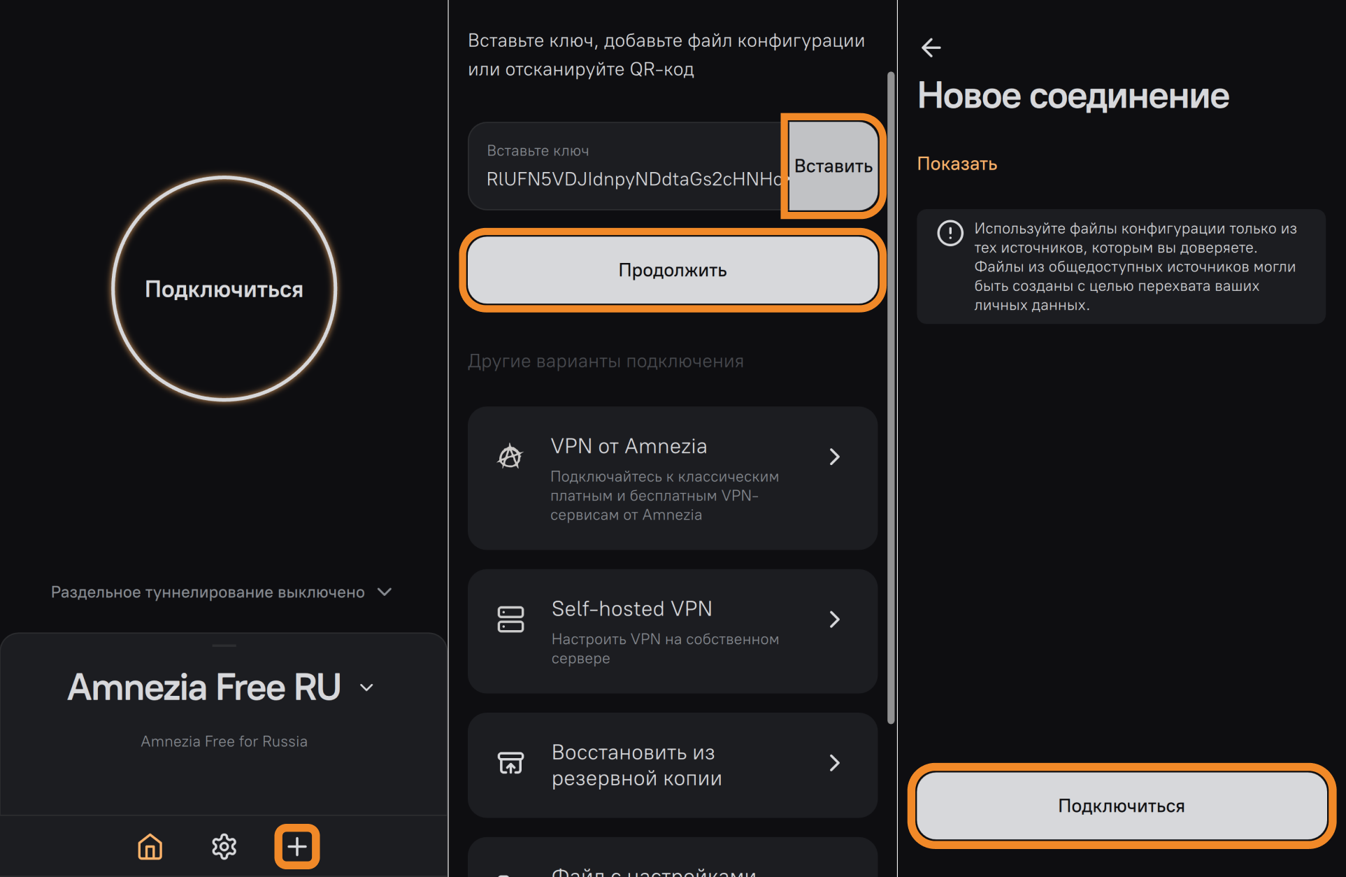 - Вставьте ключ в первую строку приложения AmneziaVPN на втором устройстве и нажмите Подключиться.