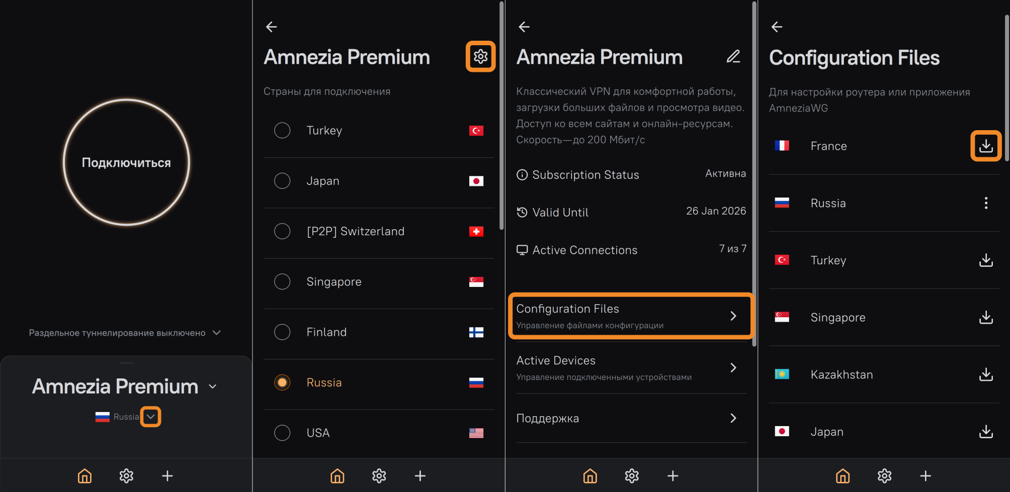 Если вы решите использовать AmneziaWG, вместо ключа нужно будет использовать файлы конфигурации из личного кабинета. Один файл конфигурации дает возможность подключиться только к одной локации, его можно подключить только к одному устройству и он считается одним активным соединением.
