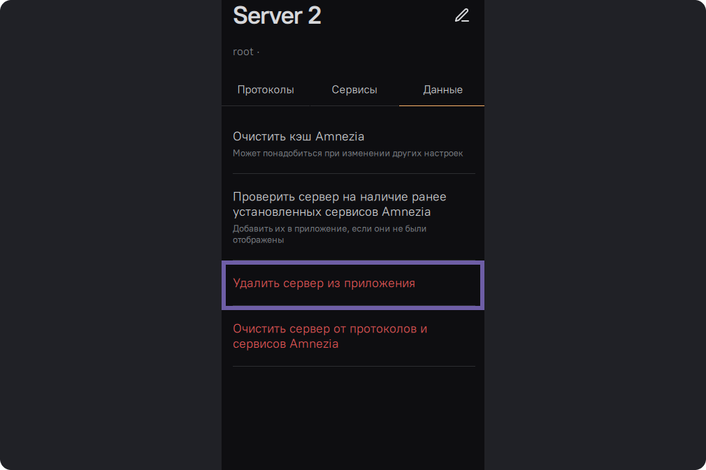 Во вкладке “Данные” выберите “Удалить сервер из приложения”.