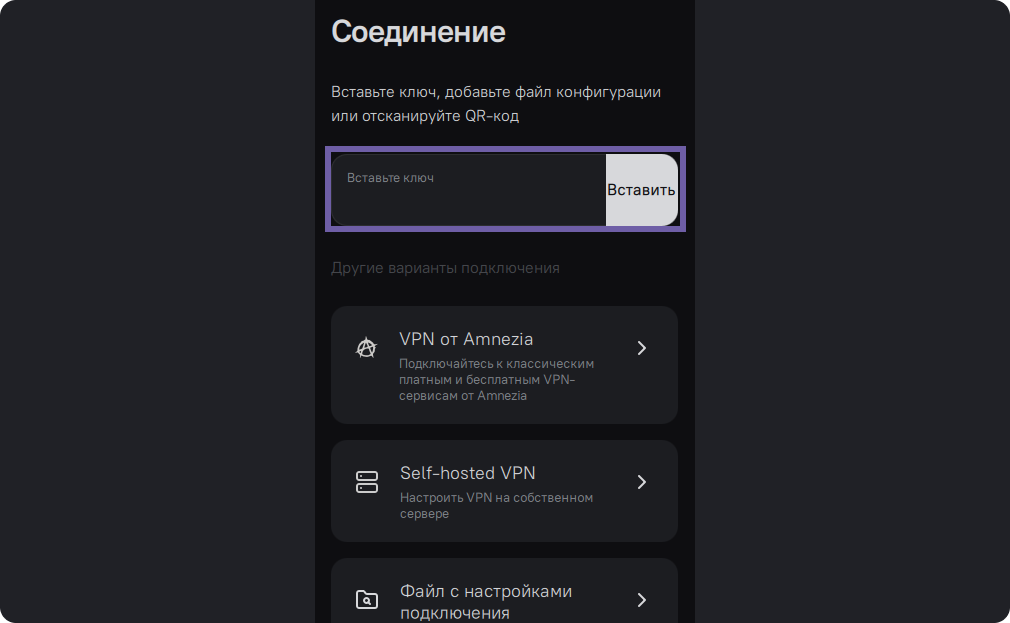 - Вставьте ключ в первую строку приложения AmneziaVPN.