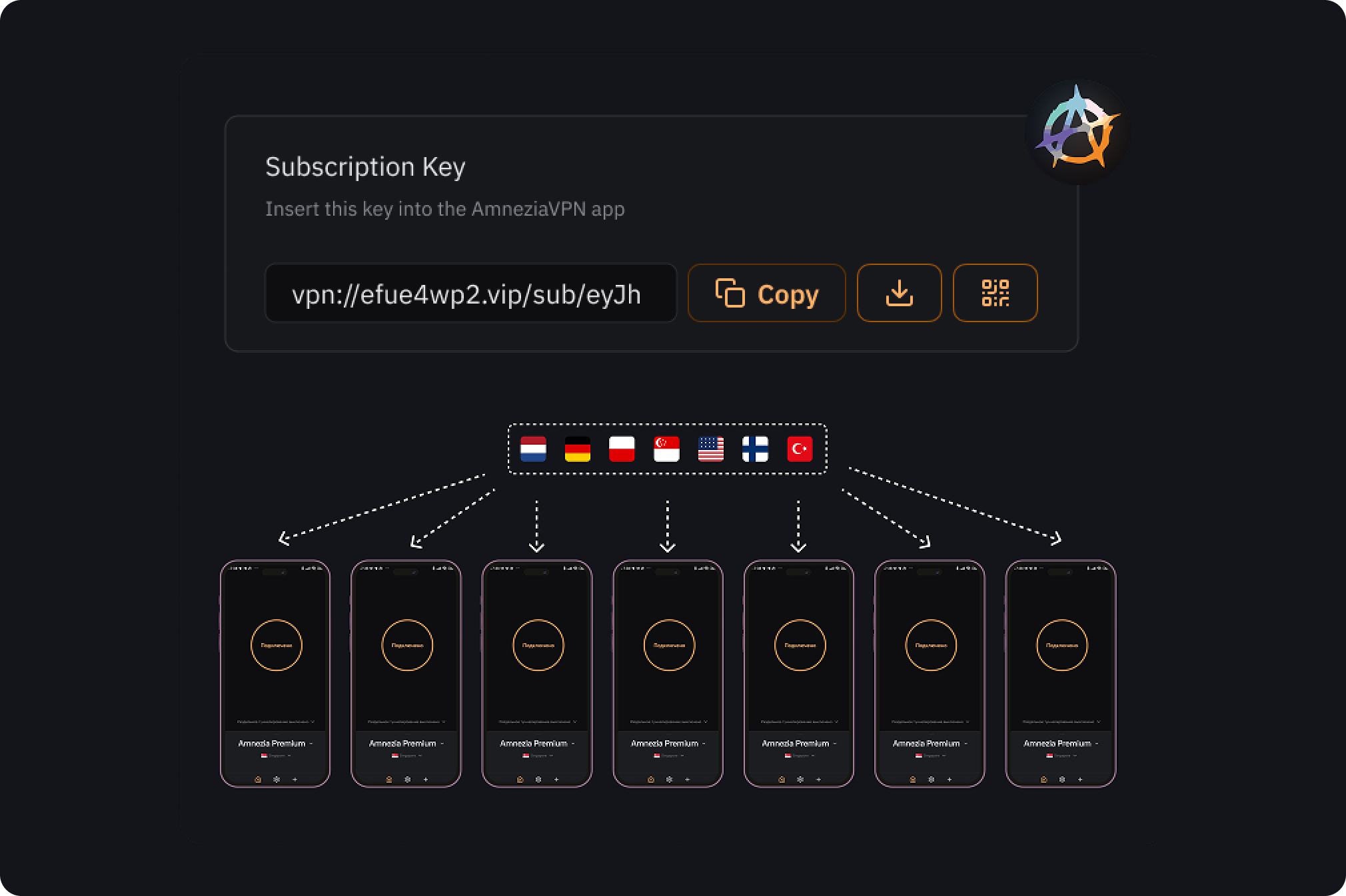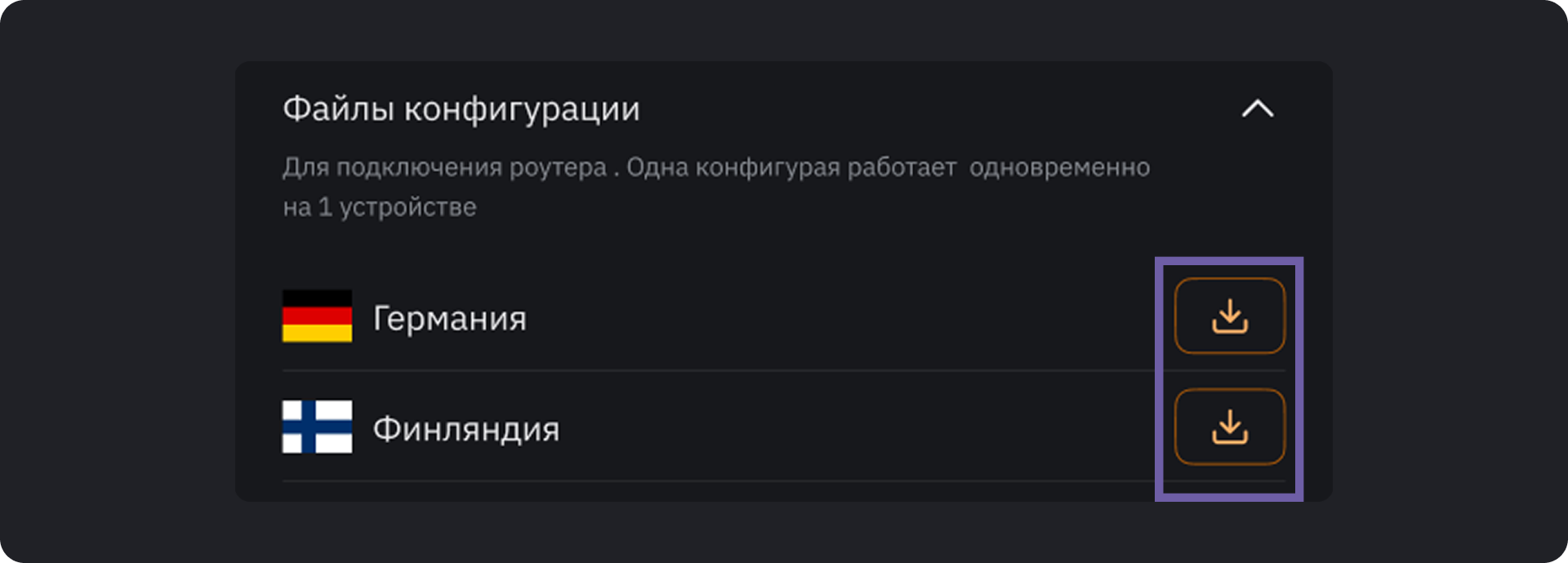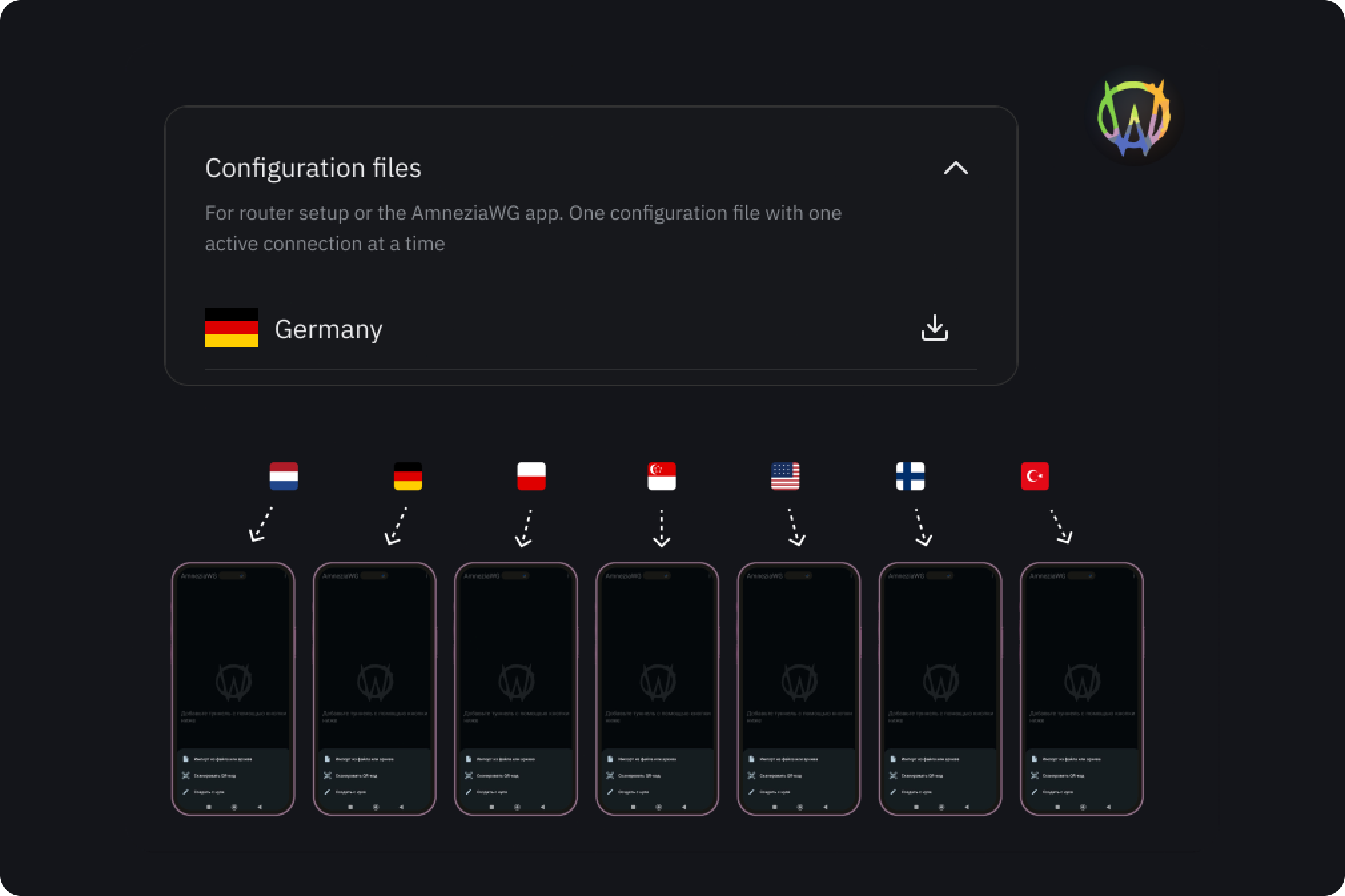 Если вы решите использовать AmneziaWG, вместо ключа нужно будет использовать файлы конфигурации из личного кабинета. Один файл конфигурации дает возможность подключиться только к одной локации, его можно подключить только к одному устройству и он считается одним активным соединением.