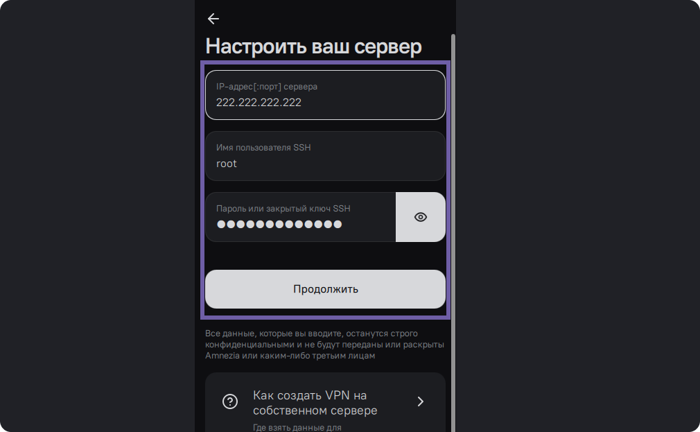 На первом экране приложение спросит ваши данные для подключения, это данные вашего VPS сервера. Если у вас нет VPS сервера, обратитесь к инструкции Как запустить свой VPN c помощью Amnezia, там собраны примеры инструкций для покупки хостинга и выбора нужных настроек. После покупки VPS, хостинг-провайдеры отправят вам на почту данные IP, User name или ID и пароль от сервера. Эти данные нам и нужны, они выглядят примерно так: