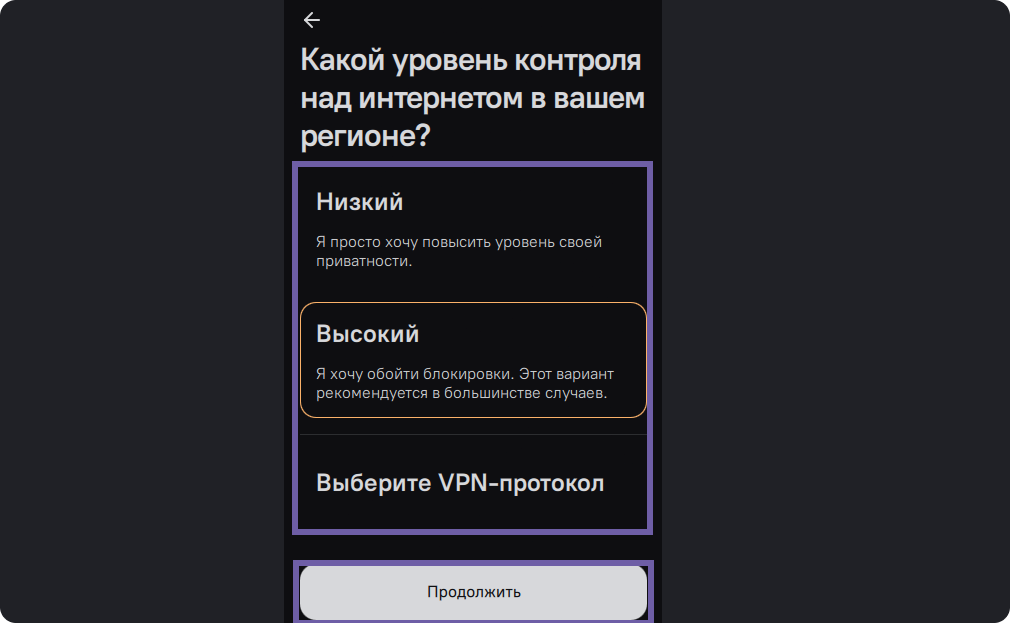 При выборе Низкого уровня контроля будет установлен протокол WireGuard . Подойдет для регионов, где не блокируются VPN-приложения и VPN-протоколы. Повышает уровень приватности пользователя, и дополнительно шифрует трафик. Он детектируется современными системами анализ трафика и заблокирован в некоторых старанах с высоким уровнем интерент-цензуры.