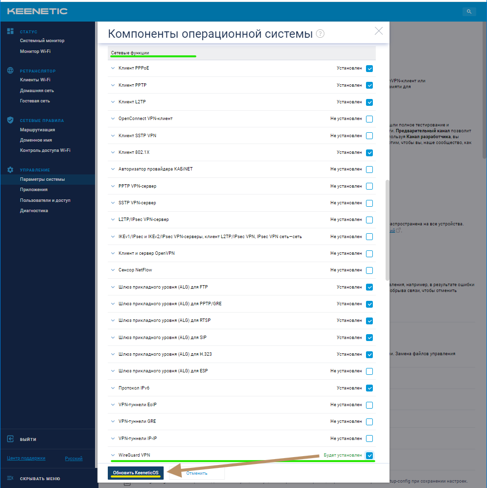 На открывшейся странице "Компоненты операционной системы", в секции "Сетевые функции", проверьте наличие установленного компонента "WireGuard VPN". Если компонент "WireGuard VPN" не установлен, отметьте соответствующий чек-бокс для установки и нажмите появившуюся снизу кнопку "Обновить KeeneticOS". Дождитесь, пока роутер обновится и переза грузится.