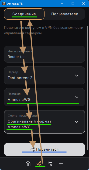После генерации нового подключения AmneziaWG нужно сохранить его в виде файла. Для этого на следующем отобразившемся экране AmneziaVPN нажмите ещё одну кнопку "Поделиться", расположенную сверху.