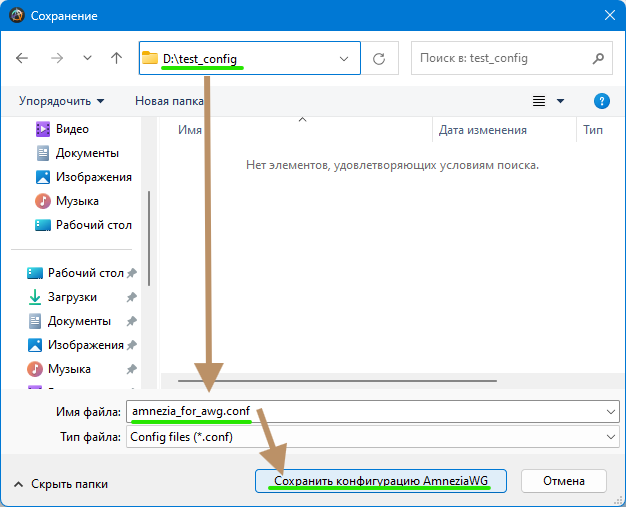 В появившемся окне файлового менеджера выберите папку, куда сохранится созданный файл, и укажите название самого файла. Запомните место сохранения файла и нажмите кнопку "Сохранить конфигурацию AmneziaWG"