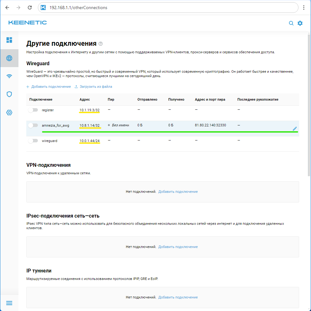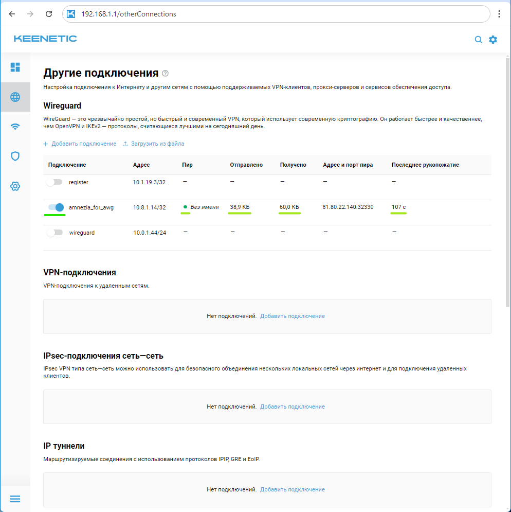 Теперь нужно перейти в раздел "Интернет", далее "Другие подключения", и проверить работоспособность созданного подключения WireGuard, переключив его состояние на "Включено". Через несколько секунд отметка активности пира должна изменить цвет с серого на зелёный. Также должна отобразиться информация о входящем/исходящем трафике и о времени с последнего "рукопожатия".