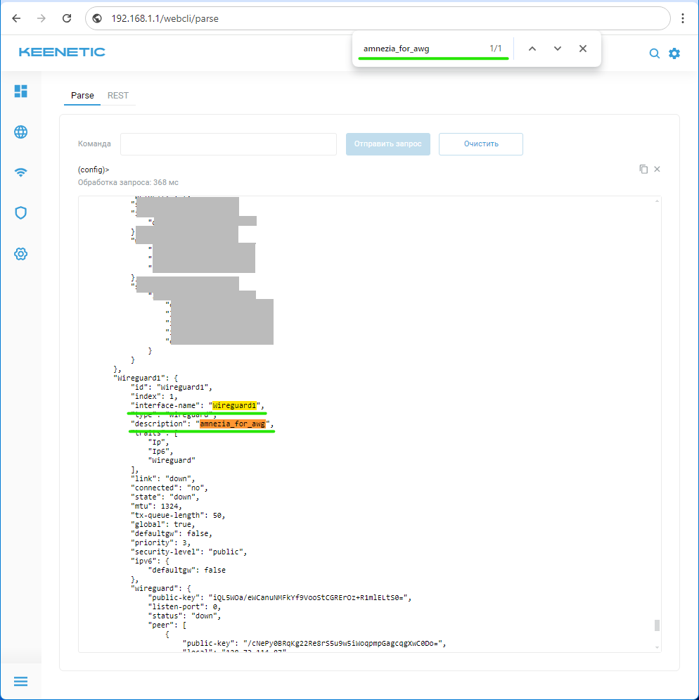 Теперь нужно узнать имя нужного интерфейса по названию созданного ранее подключения. Для этого откройте поиск по странице (это можно сделать, одновременно нажав две клавиши Ctrl+F). Введите для поиска название созданного ранее подключения. В данном примере это amnezia_for_awg. Должно быть найдено одно уникальное название в поле "description". А рядом с ним будет находиться другое поле "interface-name", в котором отображается имя нужного интерфейса. В данном примере это Wireguard1.