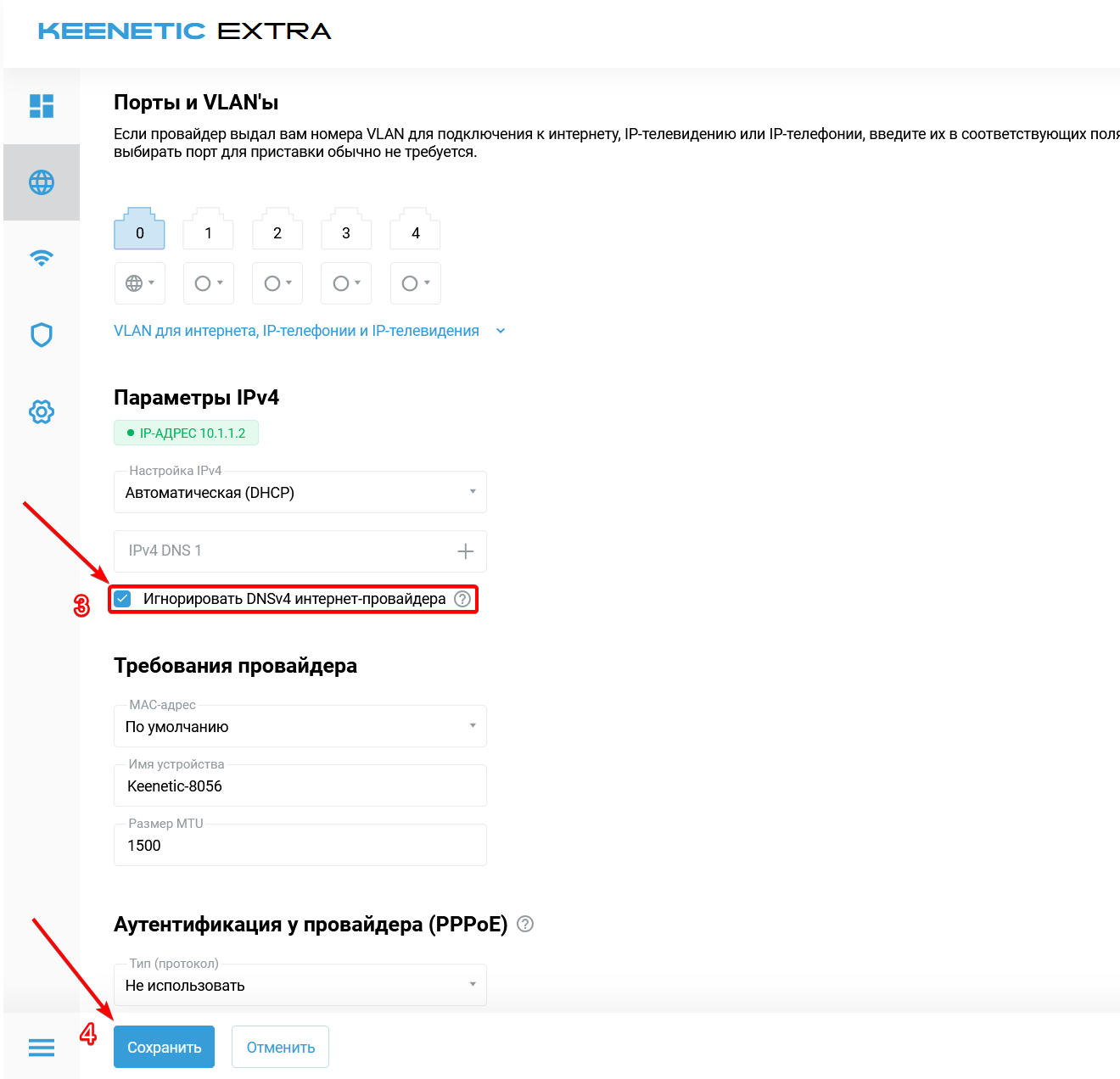 В разделе "Порты и VLANы" поставьте галочку "Игнорировать DNSv4 интернет-провайдера"